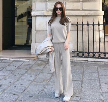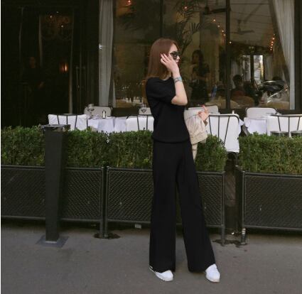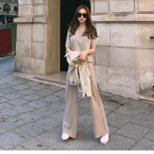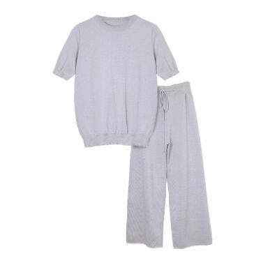 さらっとした着心地で夏にぴったりのサマーセーター×ワイドパンツのセットアップ。