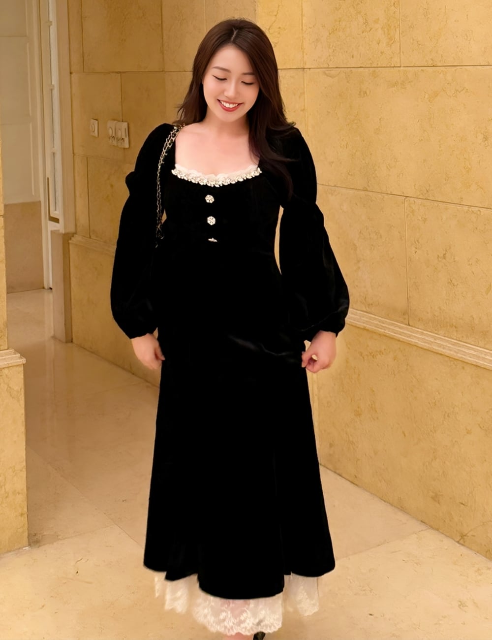 秋冬の特別なシーンにふさわしい、ロング丈のワンピース。スクエアネックにあしらわれたレースフリルとビジューが、華やかでリュクスな印象を与え、長袖のパフスリーブがフェミニンな雰囲気を引き立てます。 控えめなマーメイドラインが、上品でエレガントなシルエットを演出。裾から覗くシアーな花柄レースが、さりげない抜け感と清楚な魅力を添えます。 結婚式やお呼ばれ、レストランでのディナーなど、ドレッシーな場面にぴったりな一着です。