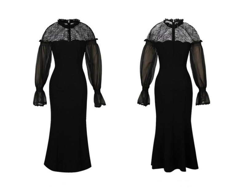 レディース ワンピース ドレス 膝下 ミモレ ミディ 長袖 パフスリーブ ラッフルカフス サーキュラーカフス ハイネック フリルスタンドカラー マーメイド フェミニン 透け感 スパンコール シアー 大人可愛い きれいめ シンプル 上品 エキゾチック エレガント 抜け感 ゴシック 都会的 ラグジュアリー ロマンティック セクシー 色気 シック センシュアル 無地 春 秋 冬 謝恩会 結婚式 二次会 披露宴 お呼ばれ お出かけ パーティー レストラン ホテル スタイルアップ S M L XL 黒 ブラック | ABCZ10