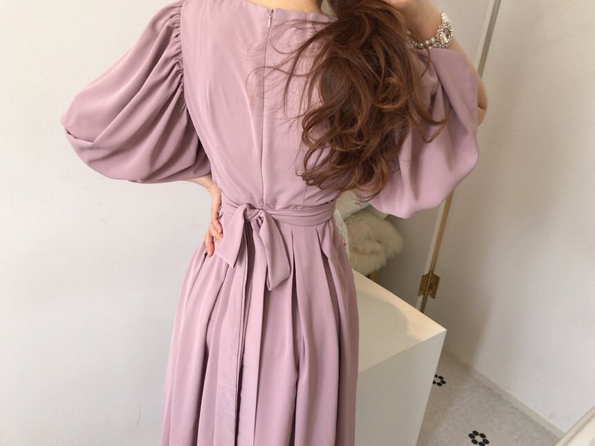 柔らかなピンクの色合いと、クラシカルなパフスリーブが魅力的なロングワンピースです。上品で洗練されたシルエットが、着る人の女性らしさを引き立てます。
