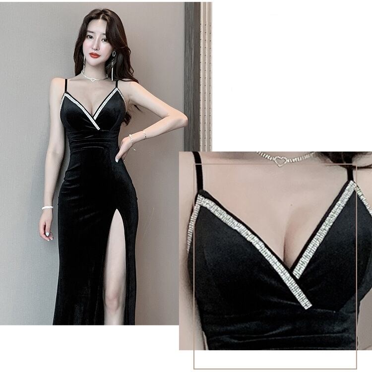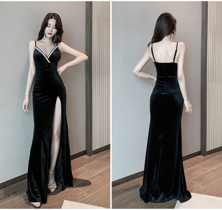 なめらかなベルベット素材が、ラグジュアリーな存在感を放つマキシ丈ドレス。スパゲッティストラップとVネックがデコルテを美しく見せ、スリムフィットのボディコンシャスなシルエットが色気とエレガンスを両立。大胆なスリットが美脚を引き立て、歩くたびにセンシュアルな雰囲気を演出します。春や秋のパーティーシーンにふさわしい一着で、ホテルやラウンジでの特別な夜に最適。大きいサイズも展開しており、どんな体型の方にも自信を持って着こなせます。