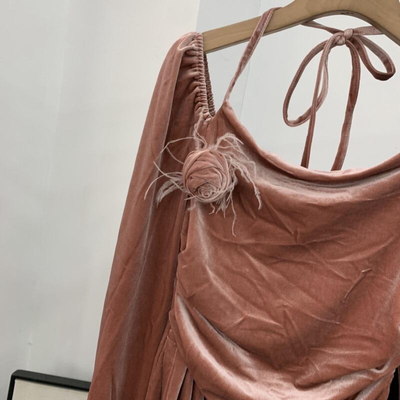 柔らかなベルベット素材が肌に優しく寄り添い、上品な光沢がラグジュアリーな印象を与えるミモレ丈ドレス。 長袖のパフスリーブがフェミニンな雰囲気を演出し、ホルターネックとオフショルダーの絶妙な肌見せが色気を引き立てます。ハイウエストのギャザーとドレープがスタイルアップを叶え、シンプルながら華やかなデザインは謝恩会や結婚式、お呼ばれパーティーにも最適。ブラックはシックに、ピンクは大人可愛く。秋冬の特別な一日に、自分らしさを輝かせる一着です。