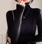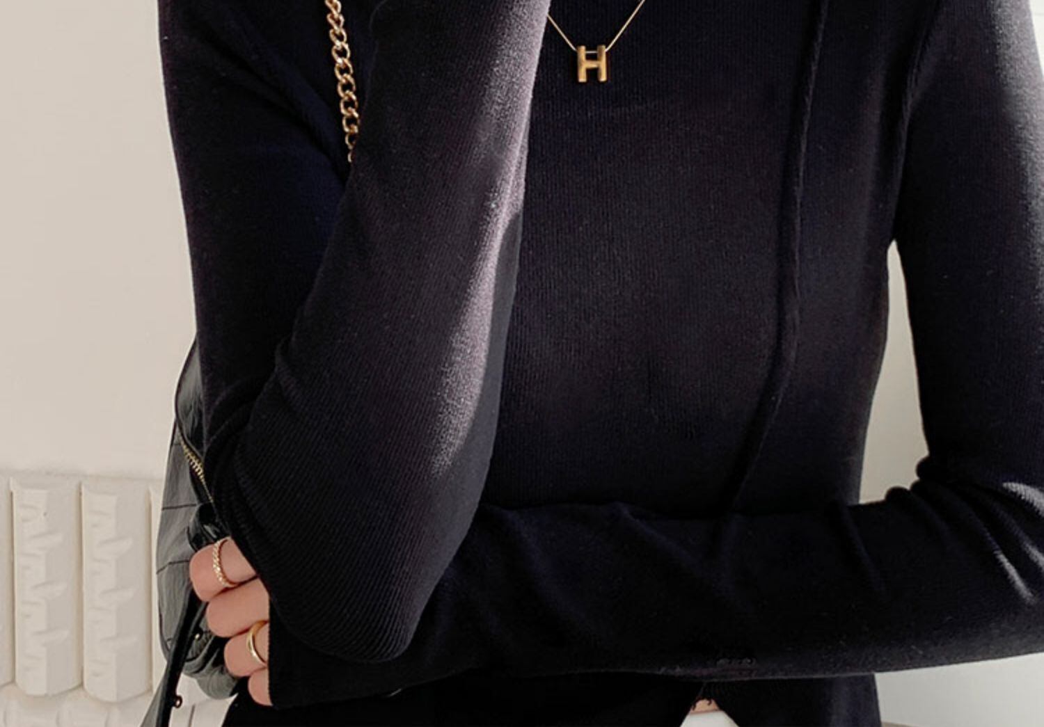 シンプルなタートルネックにアシンメトリーな裾をプラスした上品トップス。