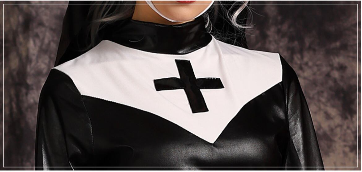 3点セット ワンピース パンツ ウィンプル レディース キャットスーツ ミニ アシンメトリー 半袖 パフスリーブ ハイネック レース レザー調 フェミニン 大人可愛い おしゃれ レトロ 個性的 ラブリー ゴシック ロリータ ミステリアス ダーク シスター 十字架 秋 冬 ハロウィン 文化祭 学園祭 パーティー イベント コンサート ライブ コスプレ 演劇 ステージ パフォーマンス 撮影 韓国 オルチャン コーデ 体型カバー インスタ映え スタイルアップ コスチューム 衣装 仮装 M L ブラック | ABCZ10