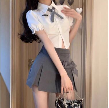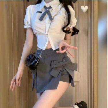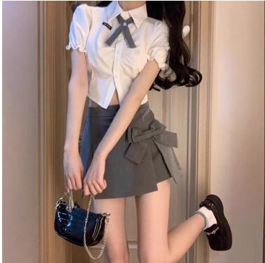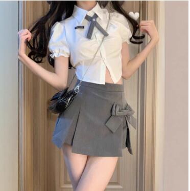 レディース トップス ボトムス ブラウス セットアップ アンサンブル スカパン ミニ ショート 膝上 クロップド丈 半袖 パフスリーブ フリル袖 襟付き 角襟 ボウタイ スリム 細身 Aライン フェミニン タックプリーツ リボン ハイウエスト 前開き ボタン かわいい きれいめ シンプル カジュアル 上品 おしゃれ こなれ感 ラフ ガーリー 抜け感 キュート 学生風 セクシー 色気 無地 夏 デート お出かけ イベント コンサート ライブ ステージ パフォーマンス 肌見せ S M L ホワイト グレー