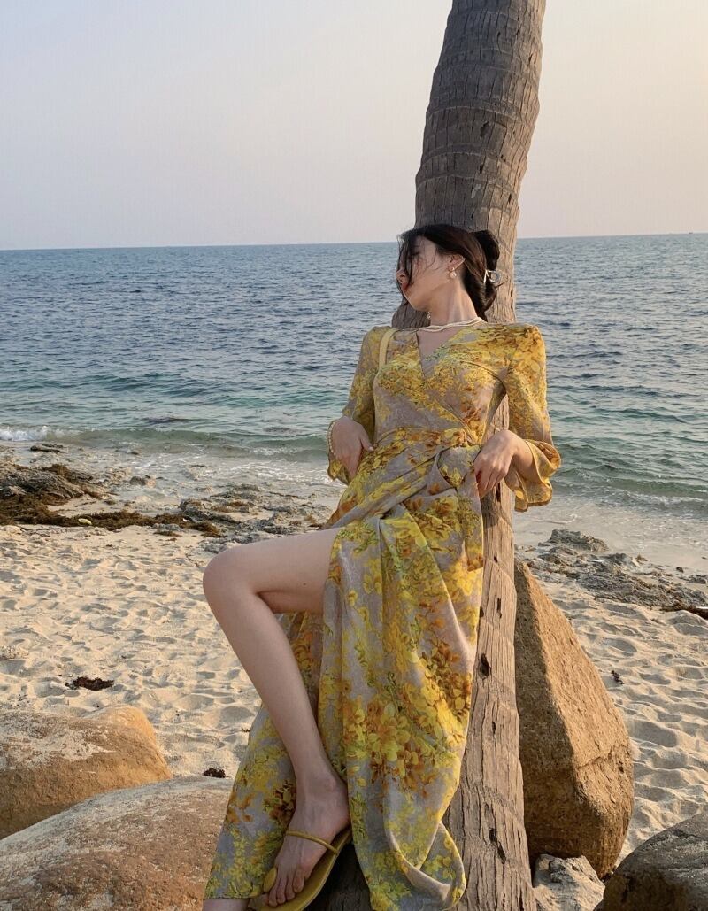 レディース ロング 7分袖 Vネック セミフレア タイト スリム ウエストマーク ハイウエスト かわいい 大人可愛い きれいめ シンプル カジュアル 上品 おしゃれ かっこいい レトロ アジアン エスニック エキゾチック こなれ感 個性的 クール エレガント モダン ナチュラル ワイルド セクシー 色気 シック 爽やか 華やか 可愛い 清潔感 ボタニカル 春 夏 デート お出かけ 旅行 海 ビーチ 休日 バカンス 体型カバー 美脚 脚長 モテ 清楚 スタイルアップ 涼しい 高見え 格上げ S M L XL