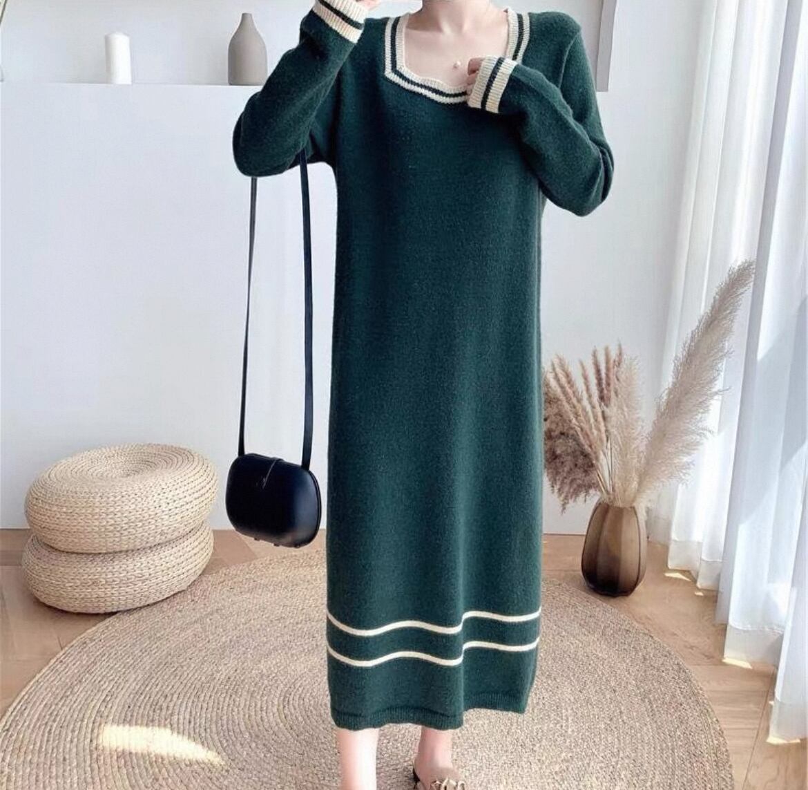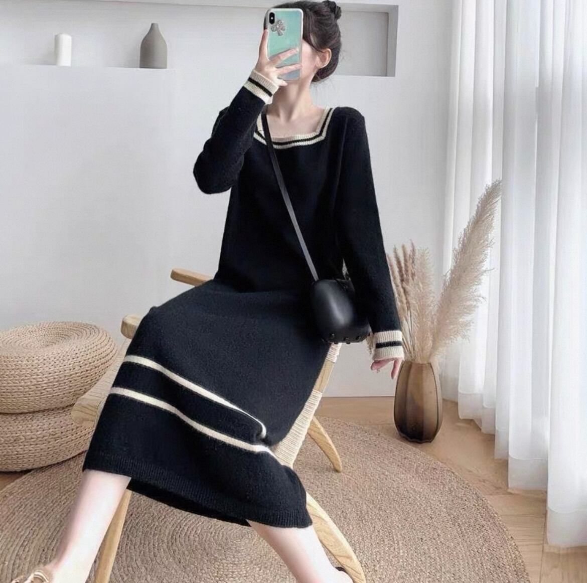 ワンピース プルオーバー レディース ニットワンピース ロング マキシ 長袖 スクエアネック ストレート Iライン バイカラー 配色 ニット 大人可愛い シンプル カジュアル おしゃれ こなれ感 ラフ ルーズ 存在感 抜け感 ナチュラル シック ライン 秋 冬 オフィス OL 通勤 デート お出かけ イベント 女子会 休日 ショッピング カフェ ランチ 韓国 オルチャン コーデ 楽ちん 暖かい 体型カバー リラックス M L XL 2XL 3XL ゆったり オーバーサイズ グリーン オフホワイト ブラック
