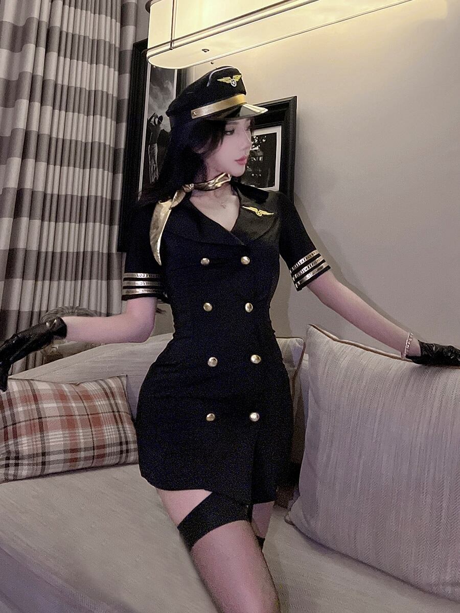 レディース ワンピース セットアップ ミニ ショート 半袖 Vネック スリム Xライン 前開き バイカラー ダブルブレスト かわいい シンプル クール キュート セクシー 色気 シック センシュアル 可愛い 春 夏 秋 ハロウィン 文化祭 学園祭 パーティー イベント コスプレ クラブ ステージ パフォーマンス 韓国 オルチャン モテ インスタ映え 定番 コスチューム 衣装 仮装 小物付き 6点セット パイロット スチュワーデス CA キャビンアテンダント 乗務員 S M L XL 2XL 黒 ブラック