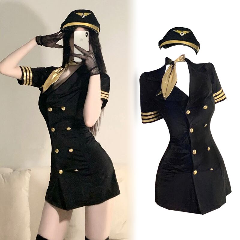 ブラックとゴールドのバイカラーが印象的な、パイロット風コスチュームセット。ミニ丈のワンピースはスリムなXラインでスタイルアップを叶え、ダブルブレストのデザインがシックでクールな雰囲気を演出します。ネクタイ、網タイツ、グローブ、帽子、鞭が付いた豪華な6点セットで、ハロウィンや文化祭、学園祭、パーティーなどのイベントにぴったり。可愛さとセクシーさを兼ね備えた、大人のためのコスプレ衣装です。