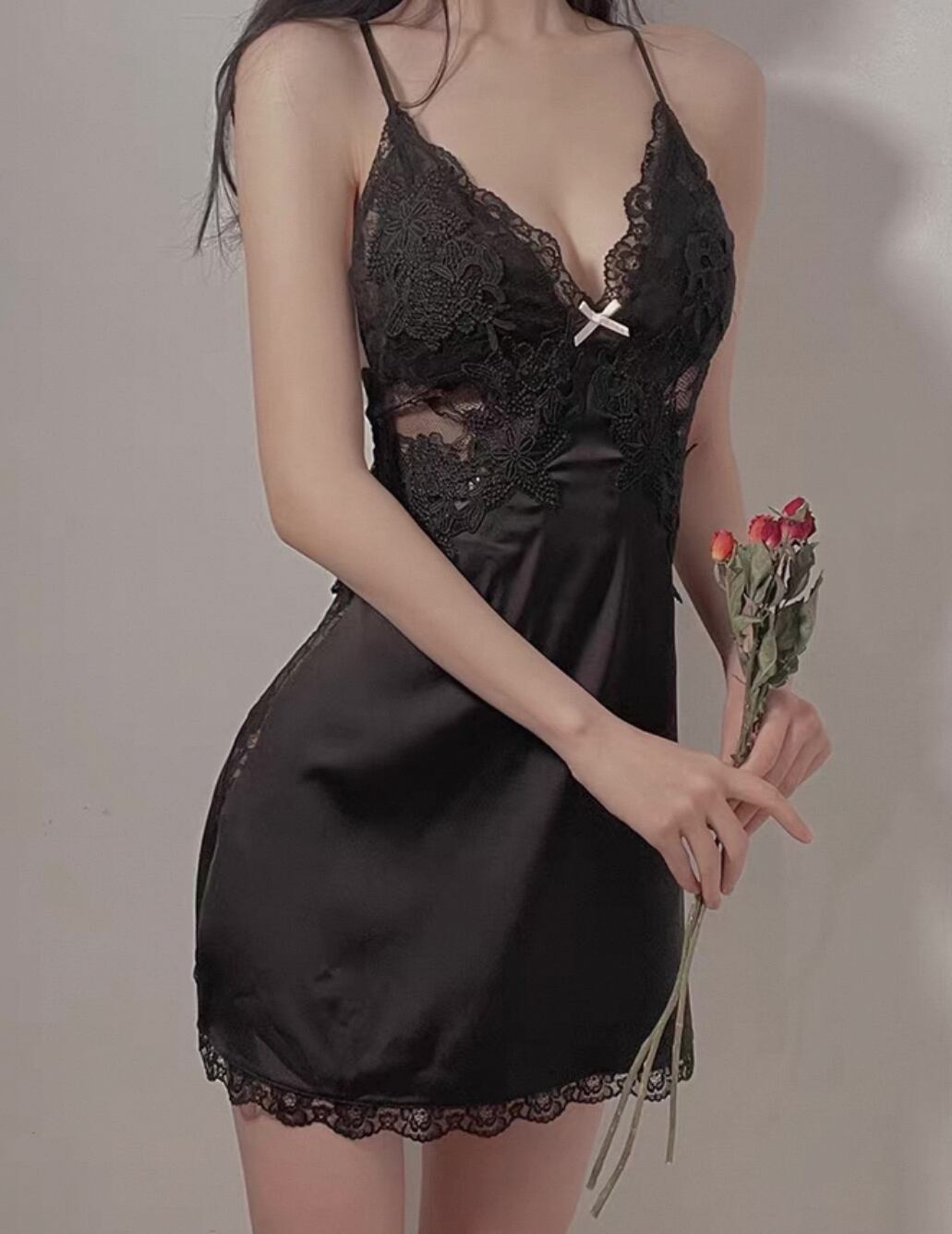 上品な光沢感とエレガントなレースを纏ったスリップドレス。