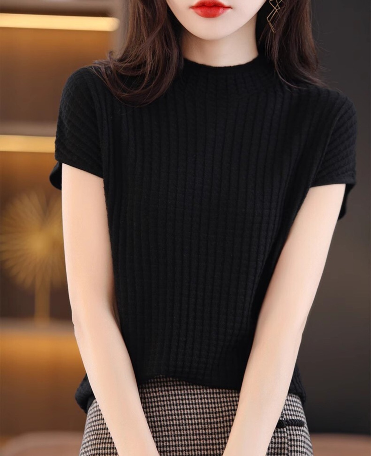 さらりと着られる半袖リブ編みニットセーター。薄手で快適な着心地ながら、ハイネックデザインが上品な印象を演出します。無地でシンプルなデザインなので、カジュアルからきれいめまで幅広く活躍。パンツやスカートとの相性も抜群で、通勤やオフィスシーンはもちろん、普段使いやデートにもおすすめ。大人可愛いシルエットで、春から秋まで長く着回せる万能トップスです。