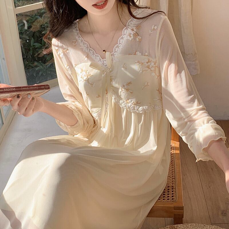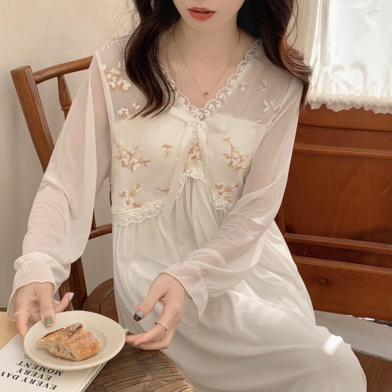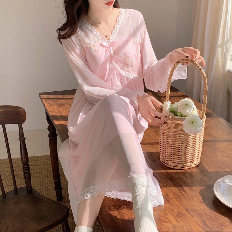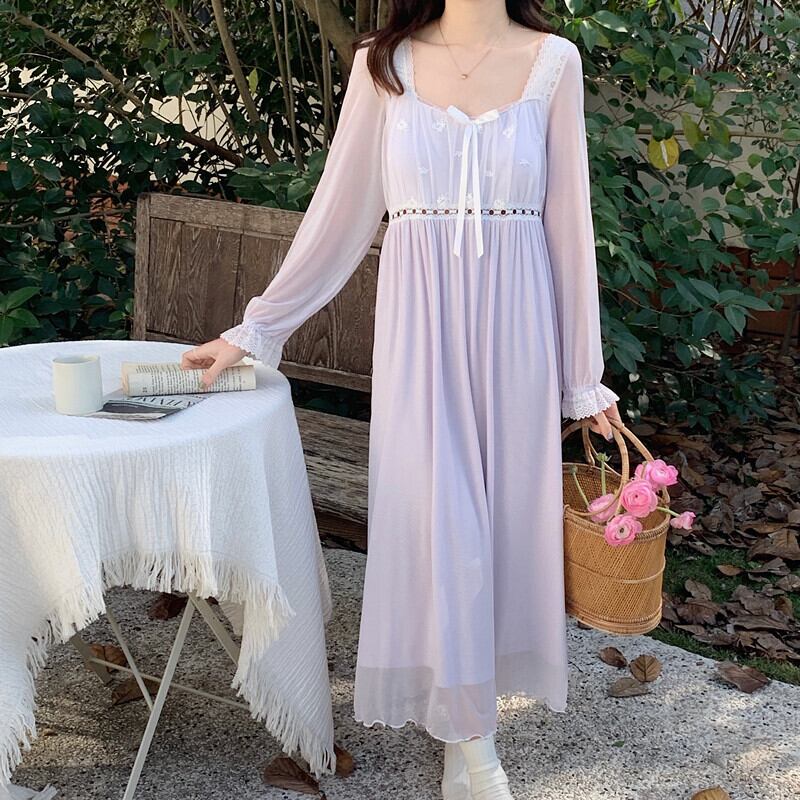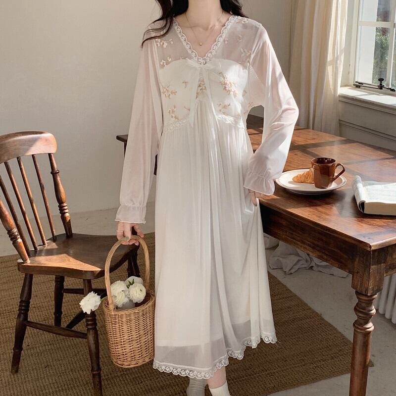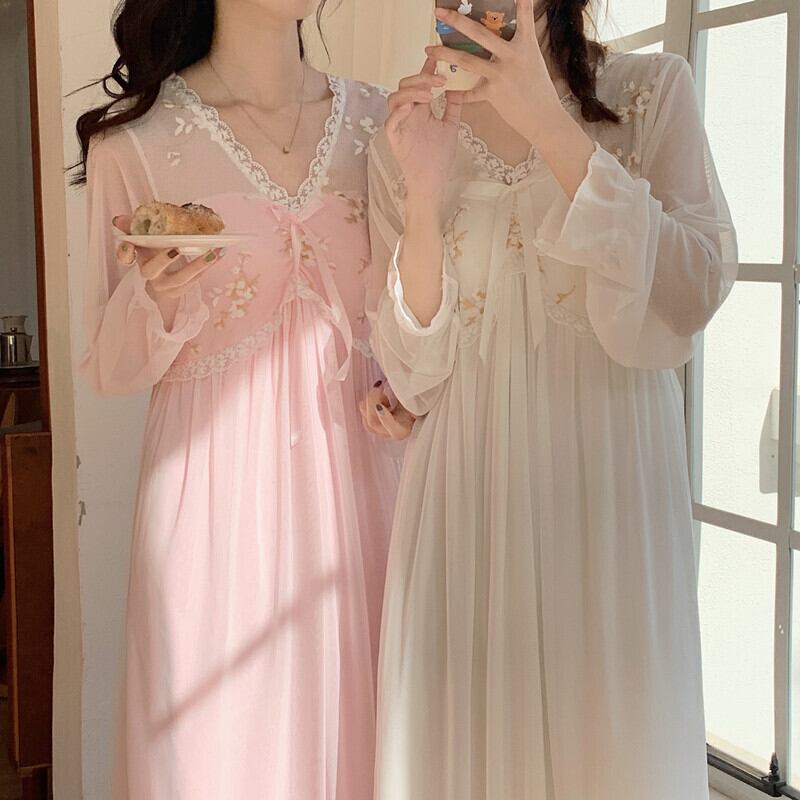 レディース ワンピース ネグリジェ ナイトウェア パジャマ 寝巻き ルームウェア 部屋着 ミモレ ロング 長袖 Vネック ペンタゴンネック セミフレア Aライン フェミニン エンパイア レース 刺繍 リボン 透け感 シアー かわいい 上品 おしゃれ レトロ ガーリー エレガント キュート ロリータ プリンセス ラグジュアリー クラシカル ロマンティック ドーリー ドレッシー 可愛い 花柄 フラワー 春 夏 お泊まり 女子会 ホテル 楽ちん リラックス M L XL ホワイト ピンク シャンパン パープル