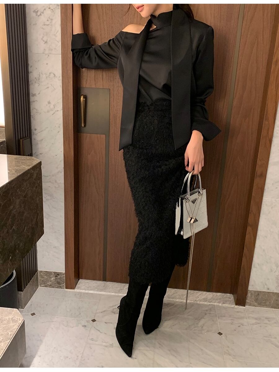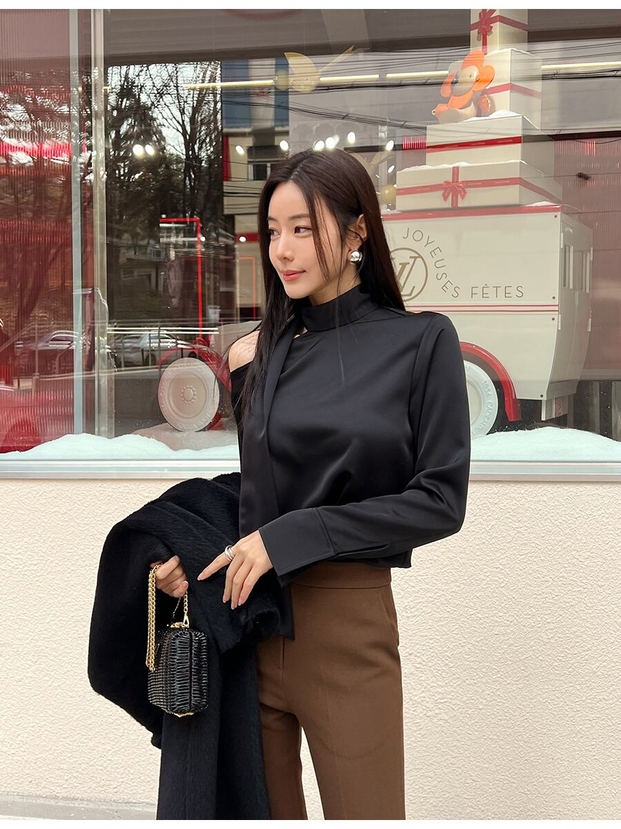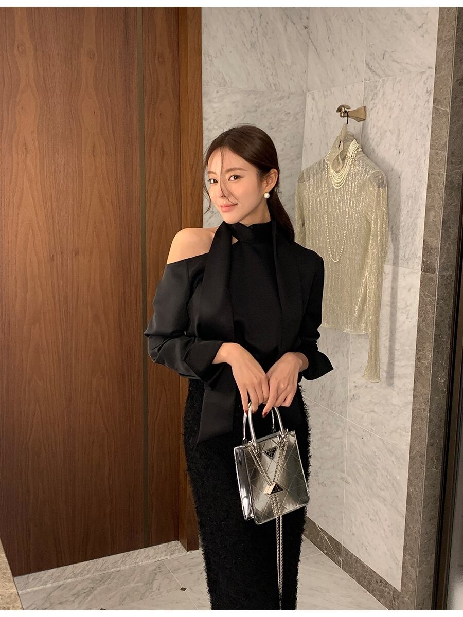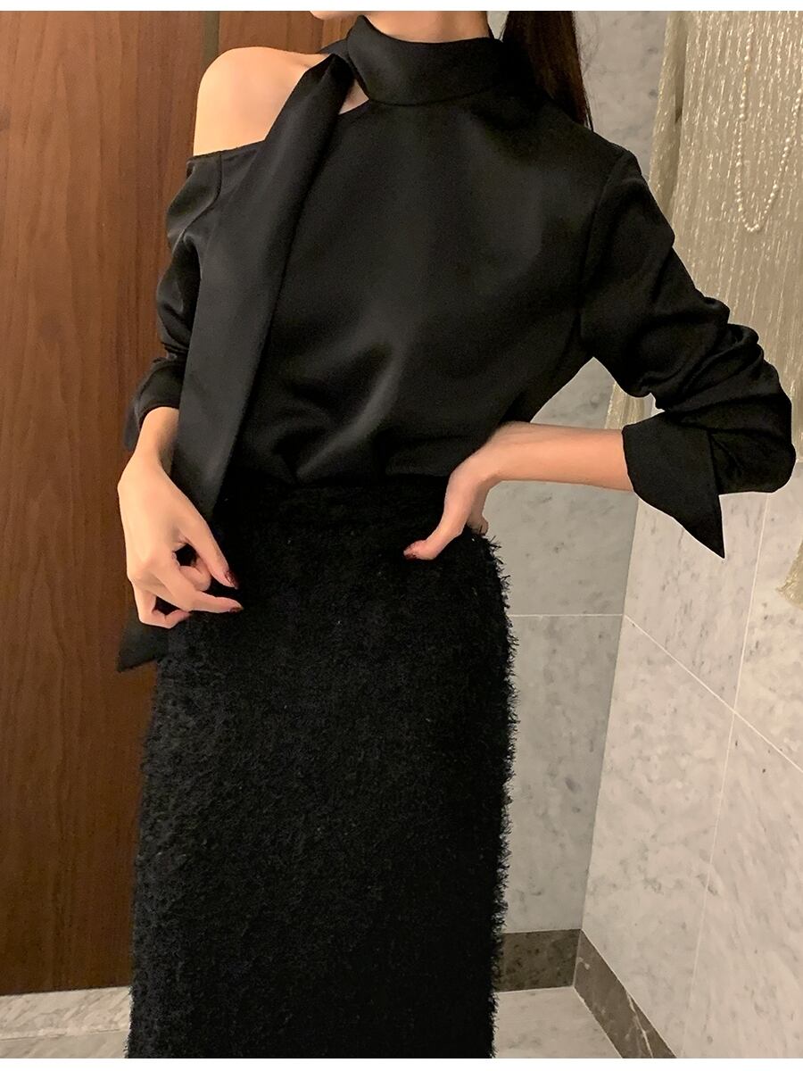 レディース トップス シャツ ブラウス 長袖 オープンショルダー ハイネック ボトルネック オフショルダー ワンショルダー スカーフタイ かわいい 大人可愛い きれいめ シンプル 上品 おしゃれ かっこいい エキゾチック こなれ感 個性的 クール モード系 エレガント モダン とろみ感 抜け感 都会的 セクシー 色気 シック クリーン エフォートレス センシュアル 無地 春 秋 韓国 オルチャン 楽ちん 普段使い 着回し トレンド 肌見せ 高見え 格上げ ゆったり フリーサイズ ワンサイズ 黒 ブラック