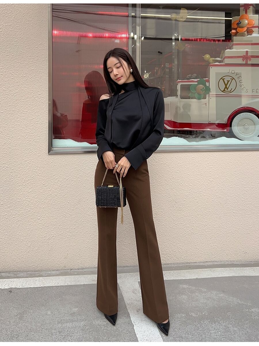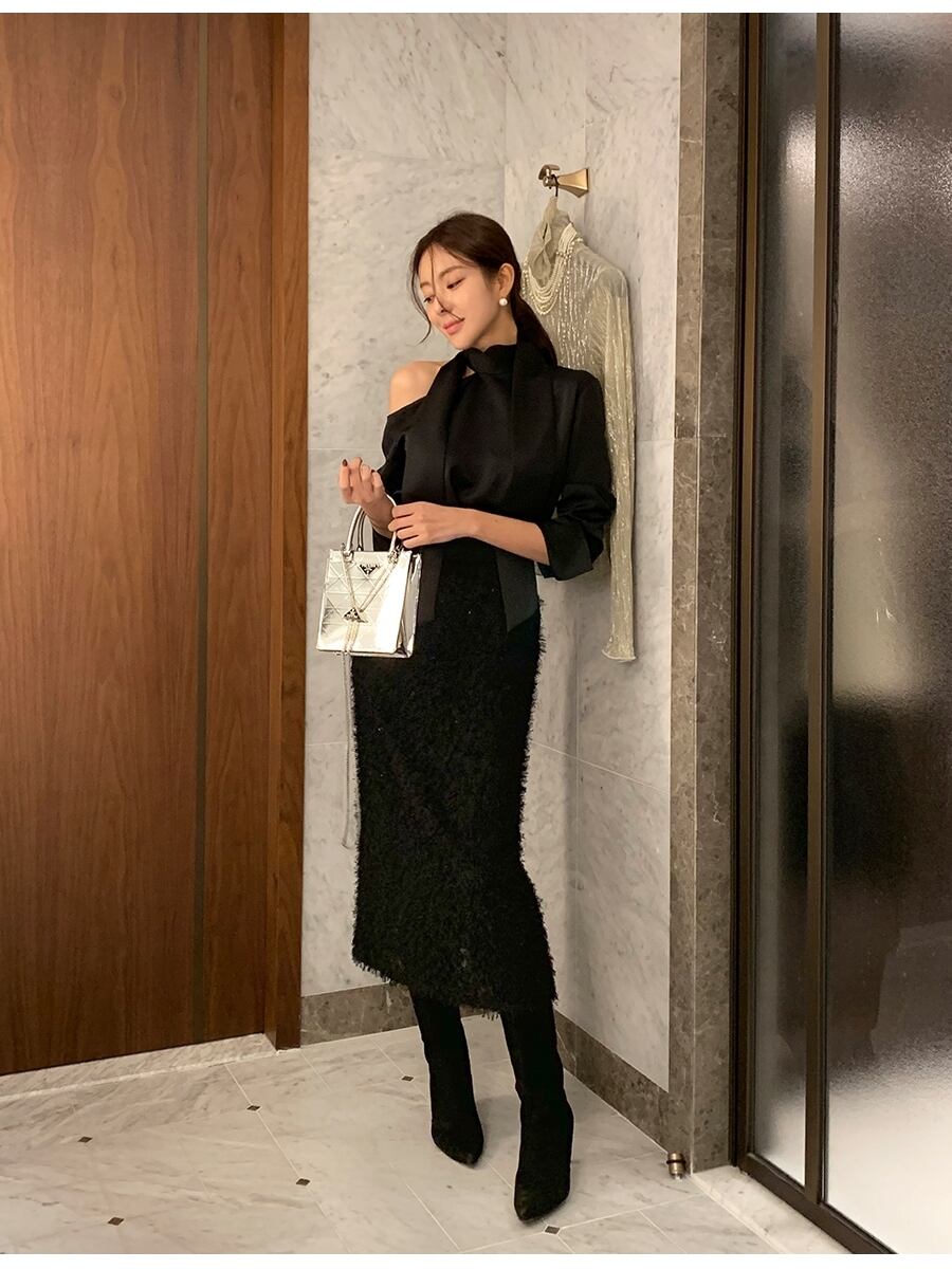 肌見せのバランスが絶妙なオープンショルダーに、スカーフタイで上品さを添えたブラックブラウス。シンプルな無地ながら、モダンでセンシュアルな雰囲気が漂い、普段使いにも特別な日にも活躍します。高見えする素材感とこなれた抜け感で、トレンドをさりげなく取り入れたスタイルが完成します。