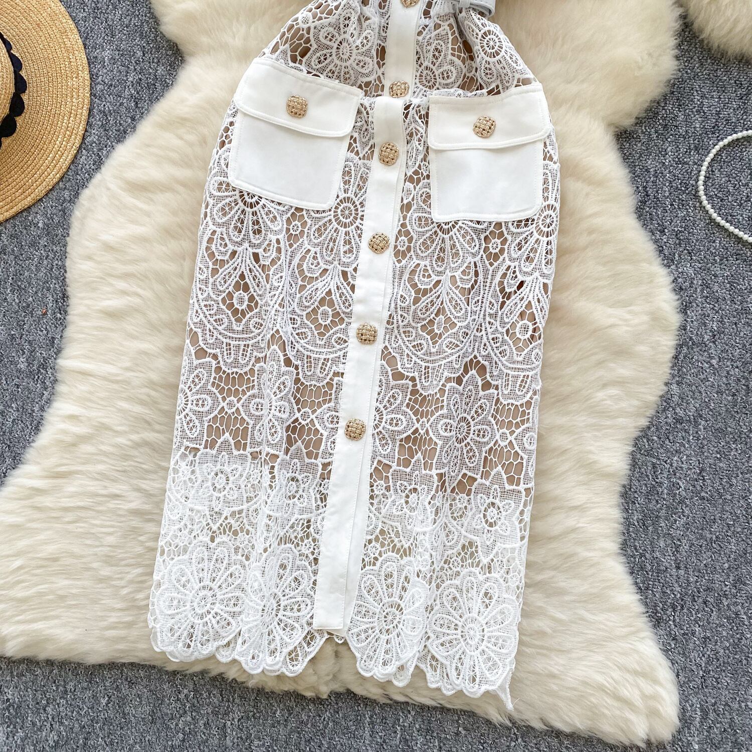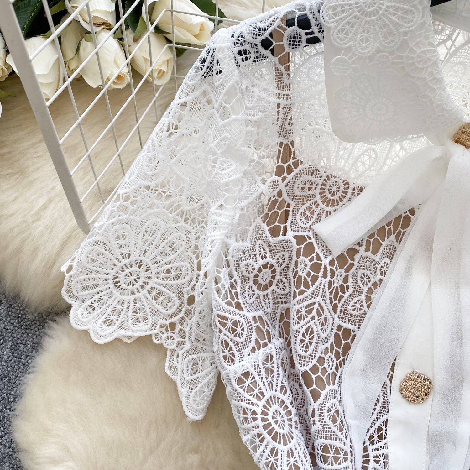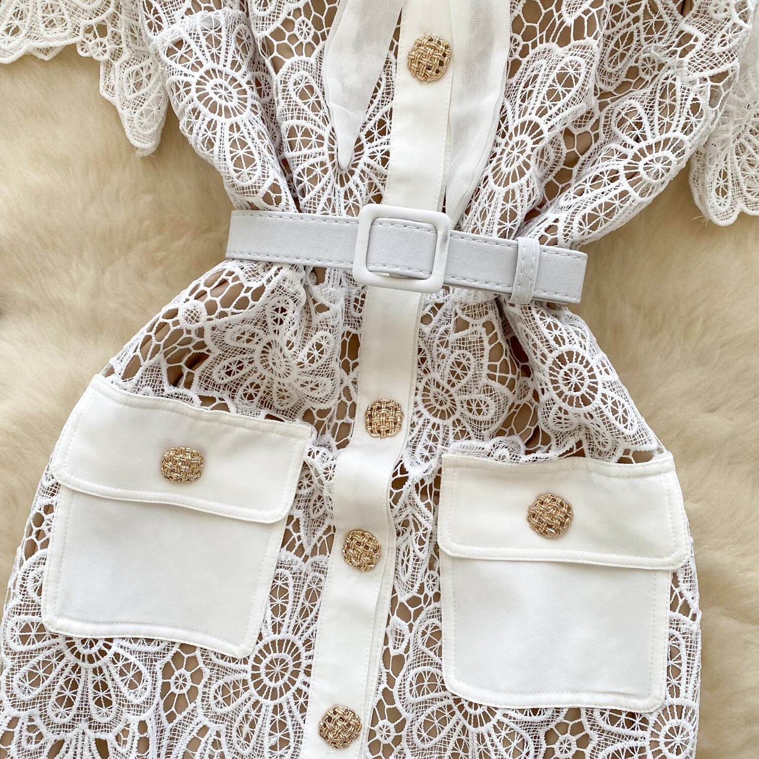 繊細な花柄の総レースが目を惹く、ロング丈のホワイトワンピース。シースルーがセンシュアルな雰囲気を演出し、裏地付きで安心して着用いただけます。クラシカルなボウタイとゴールドのボタンが上品なアクセントとなり、ベルト付きのデザインで美しいシルエットに。春夏のデートやお出かけにぴったりの、トレンド感あふれるエレガントなワンピースです。