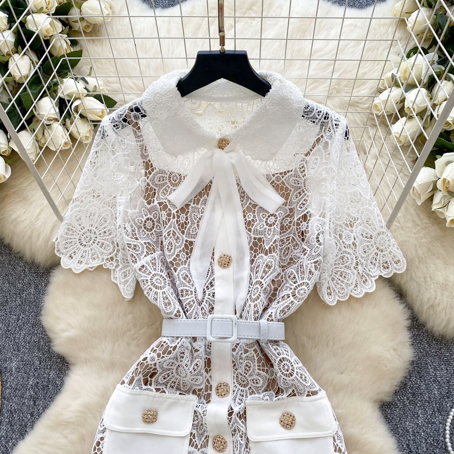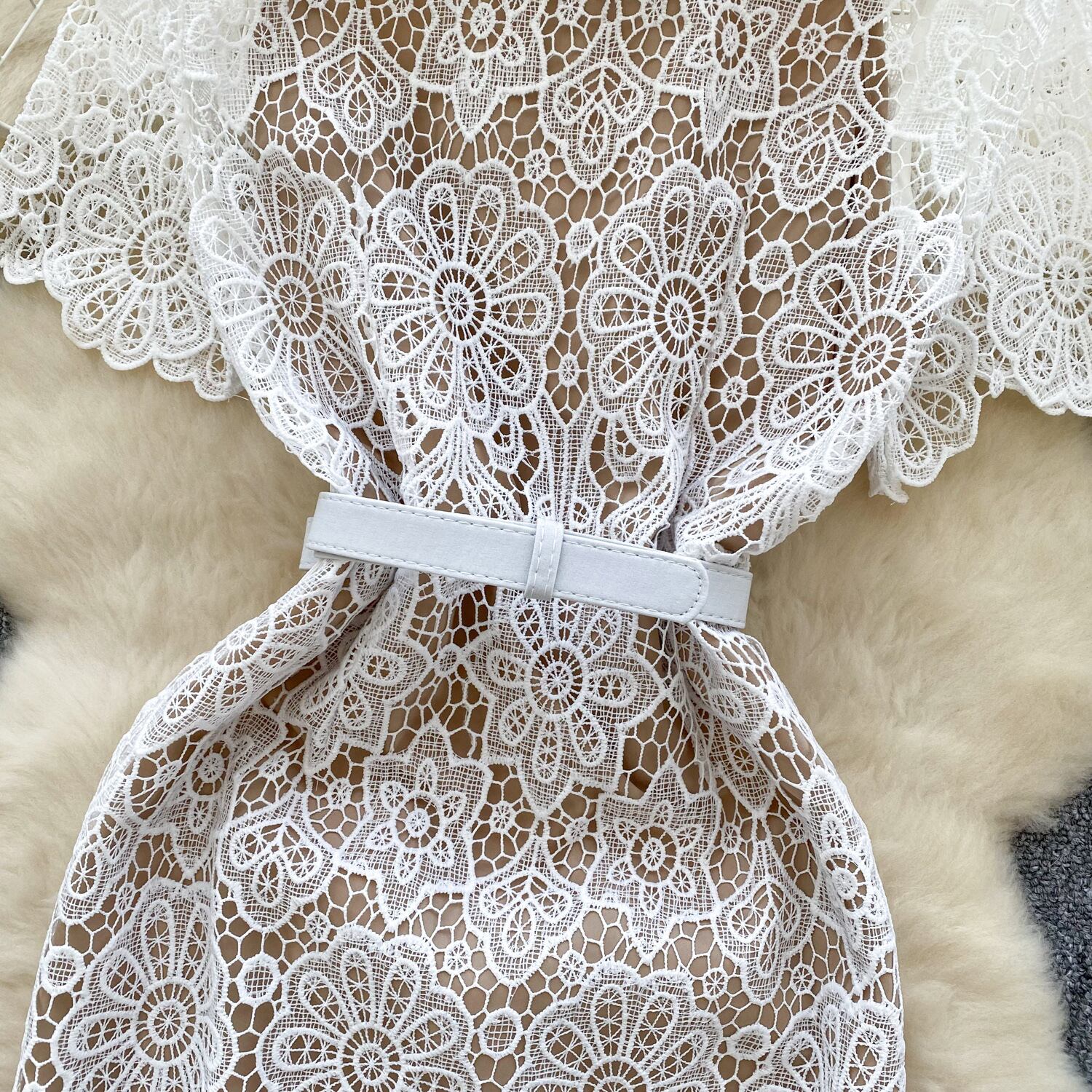 レディース ワンピース ロング 半袖 襟付き ボウタイ りぼんタイ ウエストマーク ハイウエスト 前開き 透け感 シースルー 総レース 透かし編み スカラップエッジ 薄手 シアー ベルト付き かわいい 大人可愛い きれいめ シンプル レトロ ガーリー エレガント 抜け感 キュート ロマンティック シック 華やか ドレッシー センシュアル 花柄 フラワー 春 夏 デート お出かけ 楽ちん 普段使い トレンド スタイルアップ 肌見せ 涼しい 通気性 裏地付き S M L XL 2XL ゆったり 白 ホワイト