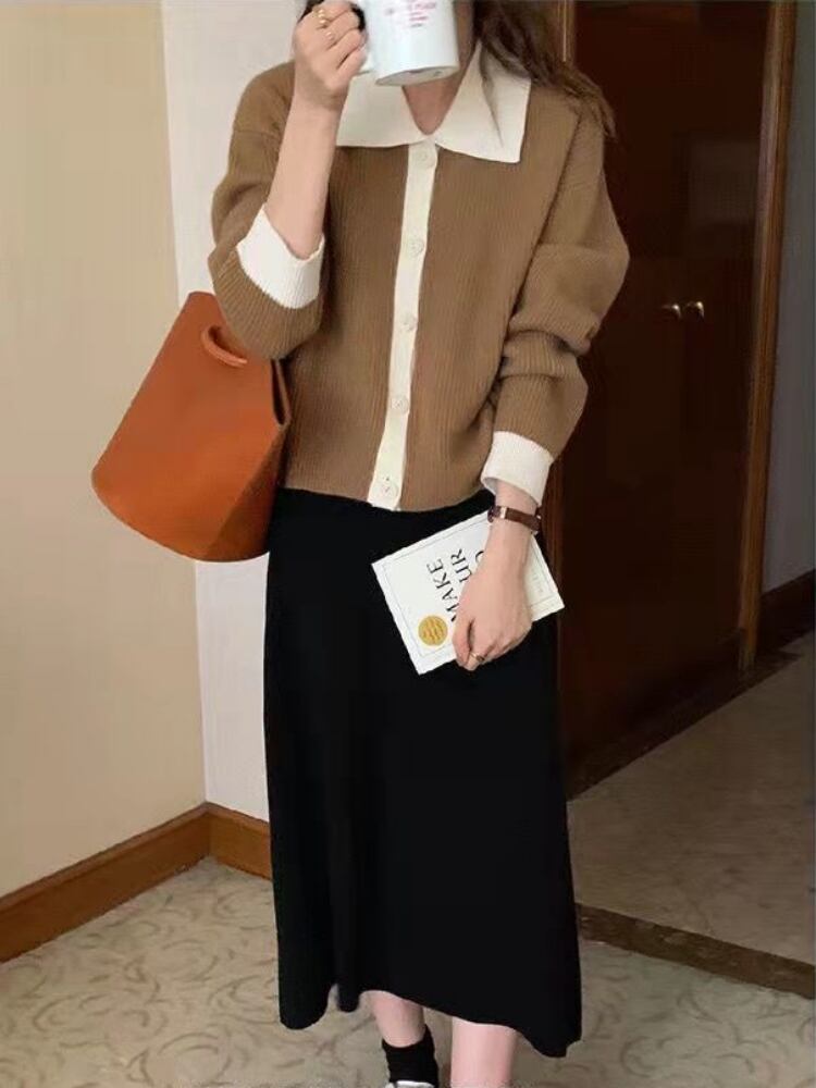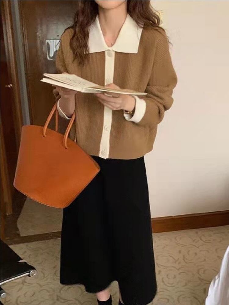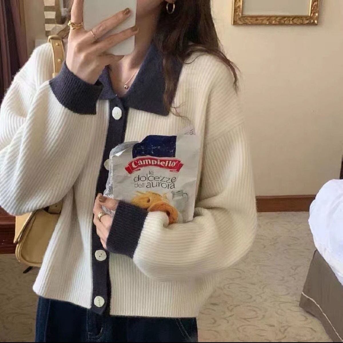 レディース トップス カーディガン 長袖 ドロップショルダー Vネック ポロカラー 前開き リブニット バイカラー ニット ストレッチ 伸縮性 かわいい 大人可愛い シンプル カジュアル おしゃれ レトロ こなれ感 ラフ ルーズ 抜け感 キュート プレッピー ナチュラル 牧歌的 エフォートレス トラッド 無地 秋 冬 デート お出かけ 休日 韓国 オルチャン 楽ちん 体型カバー 普段使い 着回し モテ 清楚 トレンド 定番 リラックス S M L XL 2XL ゆったり ゆる ブラウン オフホワイト