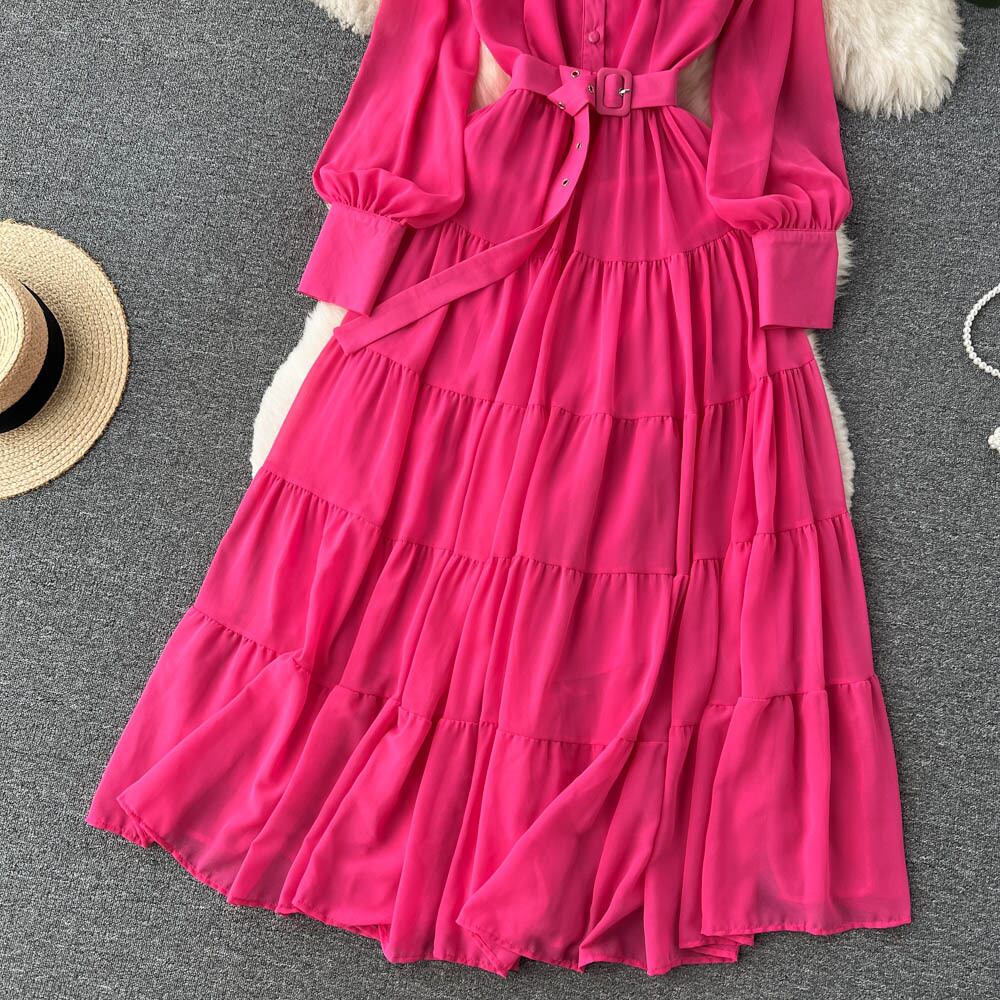 レディース ワンピース ロング マキシ 長袖 ボリューム袖 パフスリーブ ラウンドネック フレア Aライン ティアード フェミニン ベルト ウエストマーク ハイウエスト かわいい 大人可愛い きれいめ シンプル 上品 おしゃれ レトロ ガーリー エレガント キュート ロマンティック シック 華やか 無地 春 秋 デート お出かけ 休日 楽ちん 体型カバー 普段使い 清楚 トレンド インスタ映え スタイルアップ 高見え リラックス ゆったり フリーサイズ ワンサイズ イエロー ブルー グリーン ローズレッド
