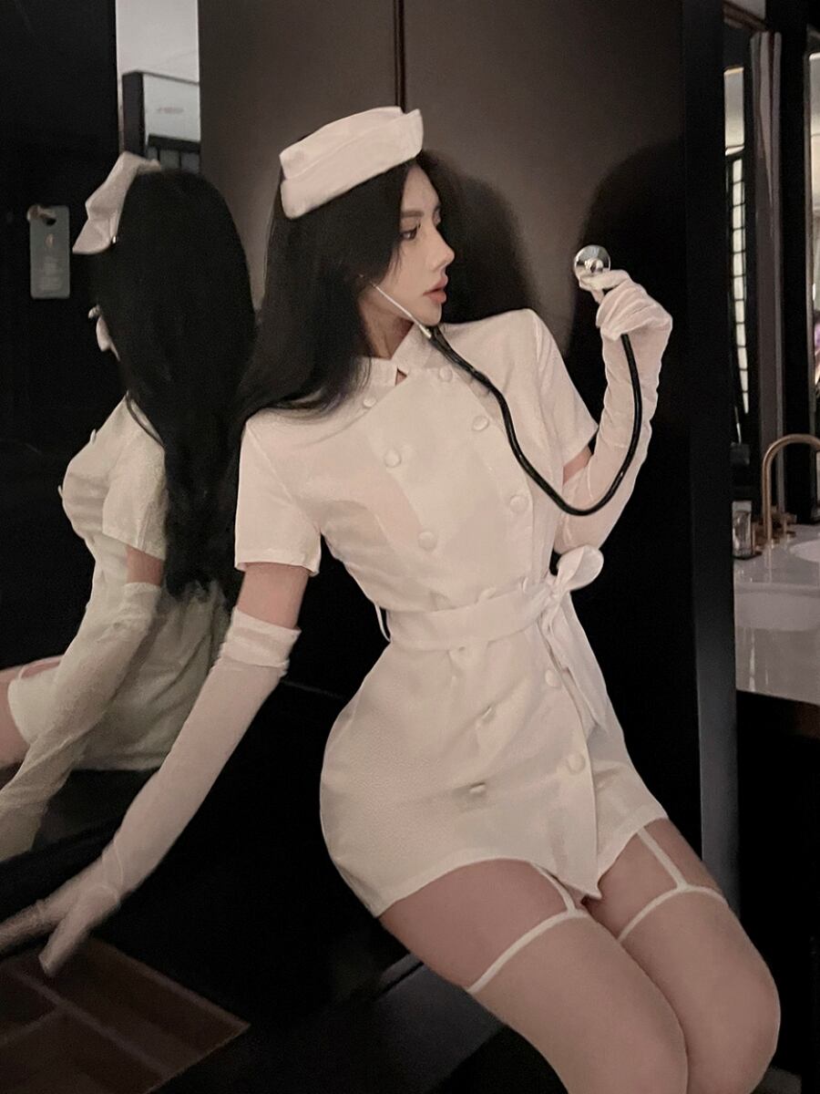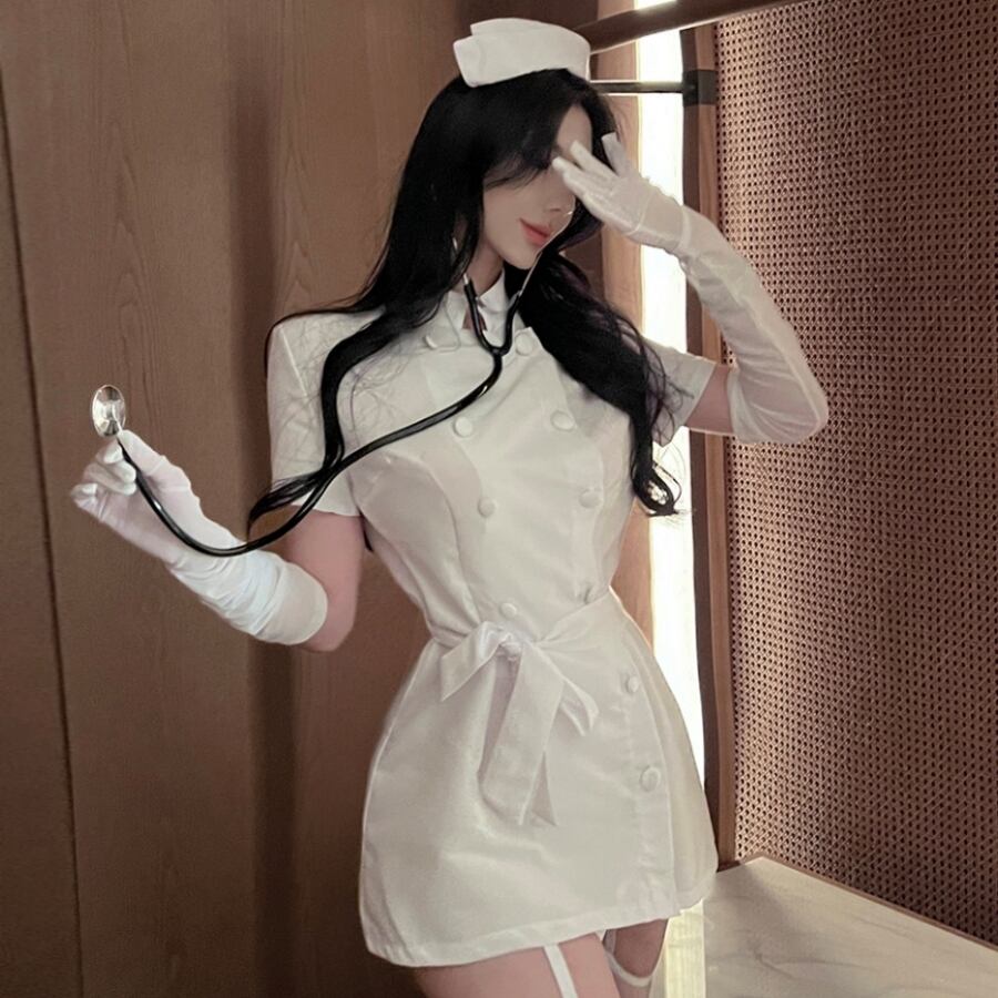 レディース ワンピース セットアップ ミニ ショート 半袖 スタンドカラー タイト スリム 細身 ボディコンシャス Xライン アワーグラスライン ウエストマーク ハイウエスト ダブルブレスト かわいい きれいめ シンプル エキゾチック 抜け感 ラブリー キュート セクシー 色気 可愛い 春 夏 秋 ハロウィン バレンタイン 文化祭 学園祭 大人用 パーティー イベント コスプレ 定番 スタイルアップ 肌見せ コスチューム 衣装 仮装 小物付き 看護師 看護婦 ナース服 3点セット S M L 白 ホワイト