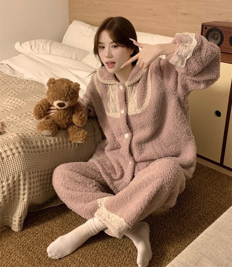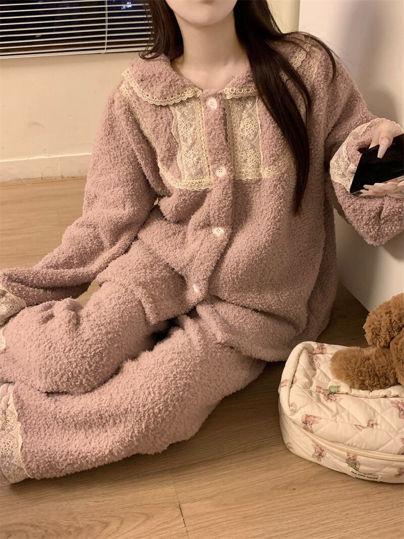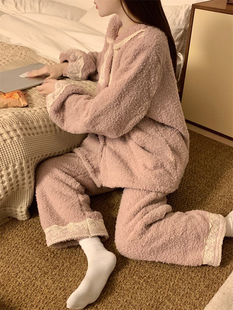 レディース ルームウェア パジャマ 部屋着 セットアップ バイピング 寝巻き フルレングス 長袖 襟付き 丸襟 セパレート フェミニン レース襟 レース 前開き ウエストゴム かわいい レトロ こなれ感 ラフ ガーリー 主役級 存在感 抜け感 ラブリー キュート ロリータ ロマンティック 華やか ドーリー 可愛い スイート 無地 冬 ホリデー 10代 20代 お泊まり 旅行 休日 楽ちん 暖かい プレゼント 体型カバー リラックス ゆったり フリーサイズ ワンサイズ ピンク くすみ
