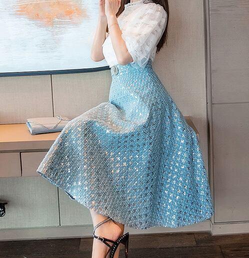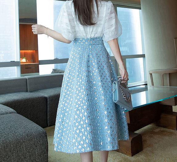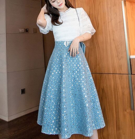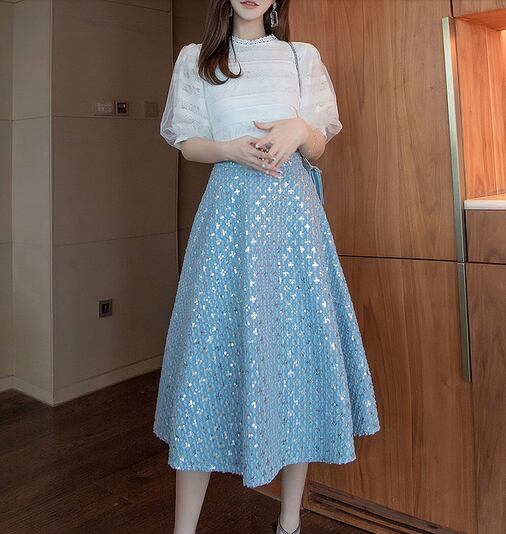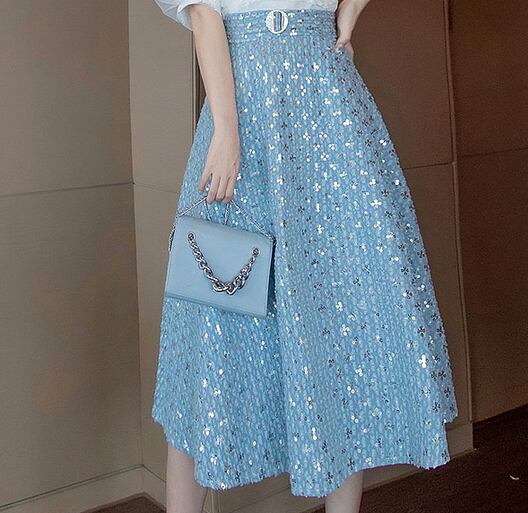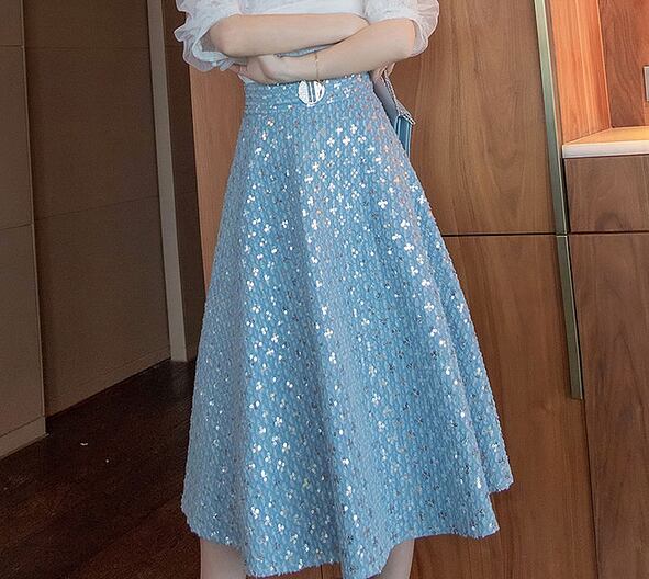 スカート ボトムス フレアスカート 膝下 フレア Aライン ウエストマーク スパンコール ブルーデニム 大人可愛い きれいめ 大人 上品 おしゃれ 大人女子 ラブリー キュート エレガント 主役級 無地 春 秋 誕生日 謝恩会 二次会 20代 30代 40代 レディース デート お出かけ 女子会 休日 パーティー イベント ホテル レストラン 着回し 普段使い オルチャン ファッション モテ 美脚 新作 インスタ映え サイズ L 2XL 色展開 ブルー