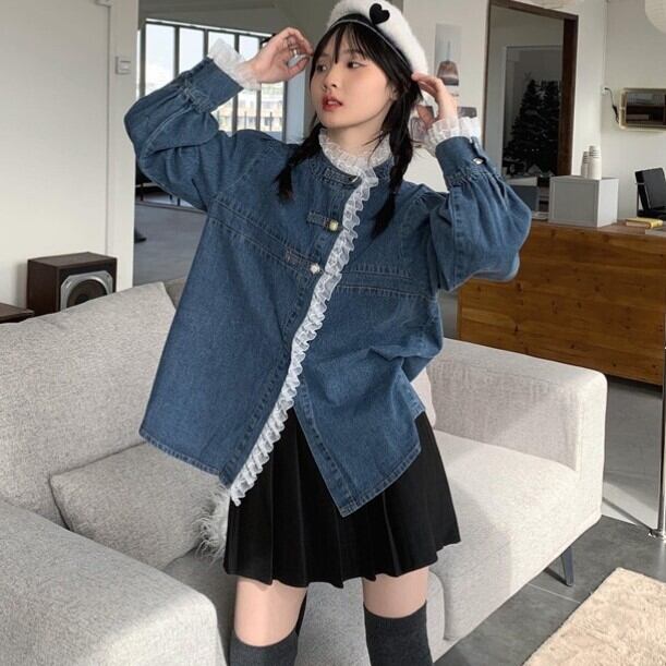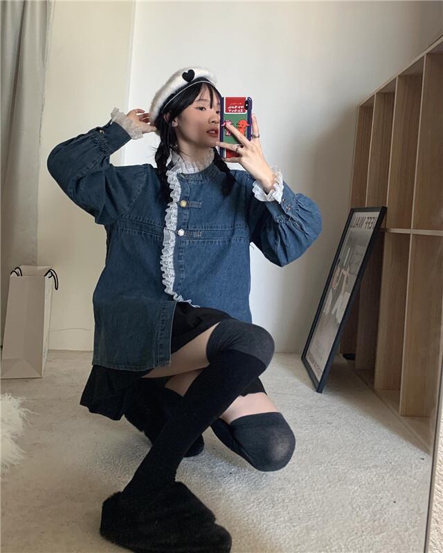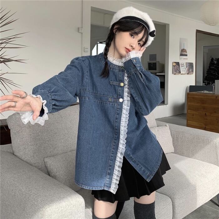 ツーピース トップス スカート ボトムス シャツ プリーツスカート ミニ丈 袖あり 長袖 ボリューム袖 スタンドカラー ストレート Aライン アシンメトリー フリル ハイウエスト ブルーデニム かわいい カジュアル おしゃれ こなれ感 ラフ ラブリー キュート ガーリー ルーズ 主役級 無地 春 秋 2022 10代 20代 レディース 学生 デート お出かけ 休日 イベント 旅行 着回し 普段使い オルチャン コーデ モテ 美脚 新作 インスタ映え サイズ S M L 色展開 ブルー