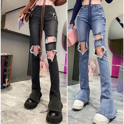 ダメージデニムパンツ ボトムス パンツ デニムパンツ ロング ロング丈 フレア ハイウエスト 綿 デニム かわいい 大人可愛い きれいめ シンプル カジュアル 大人 上品 おしゃれ お洒落 大人可愛い 大人女子 こなれ感 ラフ ラブリー キュート ガーリー 個性的 モダン 主役級 存在感 無地 春 夏 秋 10代 20代 30代 レディース 学生 通学 デート お出かけ 女子会 休日 運動 ジム ヨガ 着回し 普段使い 韓国系 オルチャン サイズ XS S M L XL 色展開 ブルー グレー