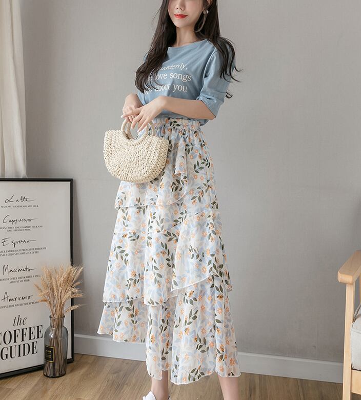 ミモレ丈の花柄ティアードデザインで女性らしいフェミニンな着こなしが可能です。