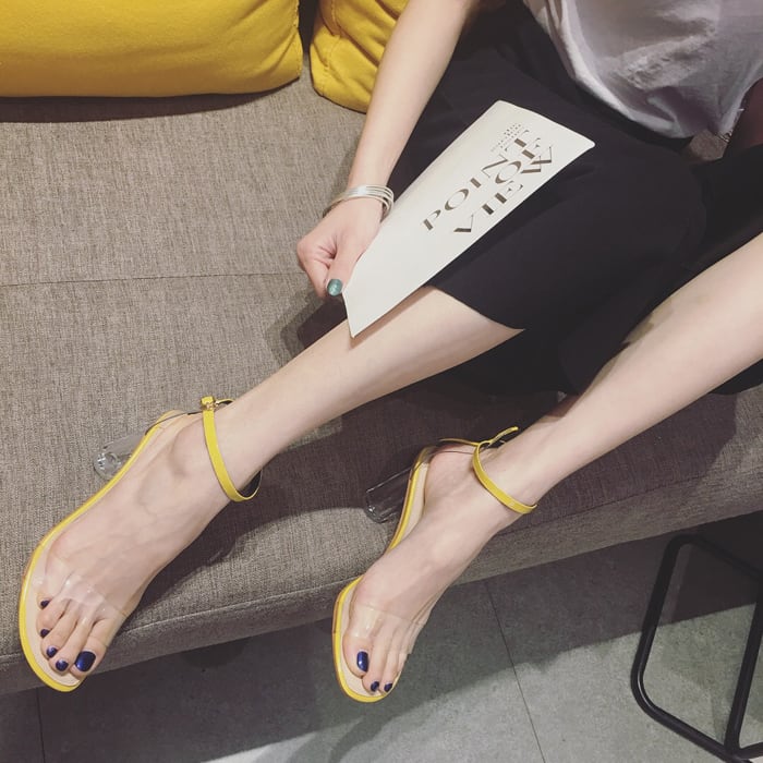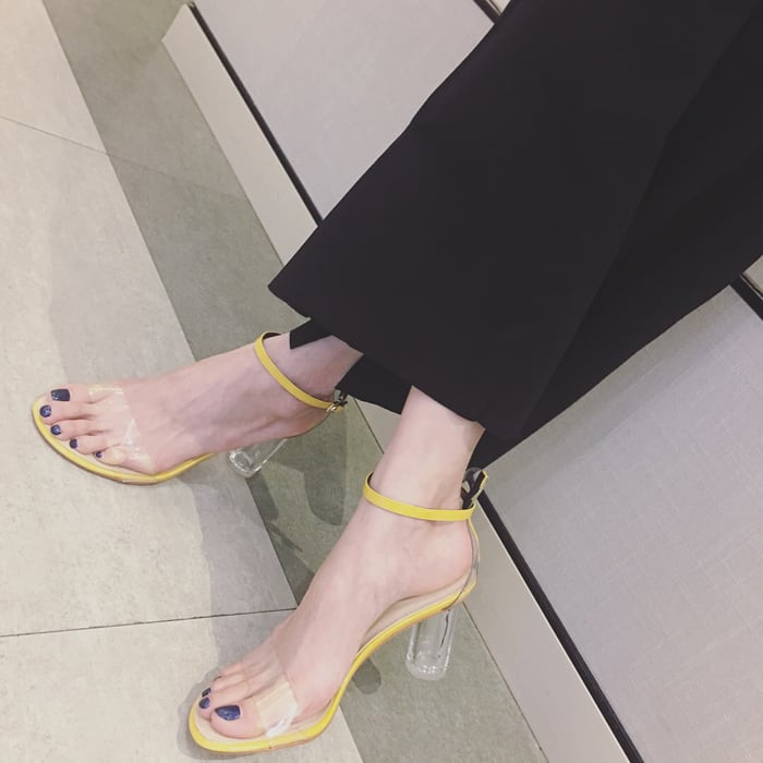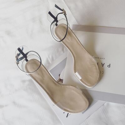 クリアのプレートヒールが夏の日差しに煌めくキレイめクリアヒールサンダル。