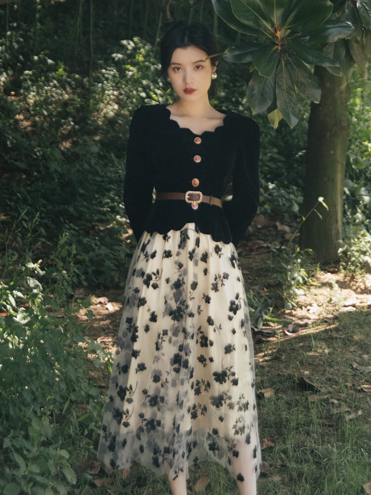 ツーピース トップス スカート フレアスカート ミモレ丈 袖あり 長袖 ラウンドネック フレア Aライン チュール ベルト ハイウエスト 透け感 大人可愛い きれいめ 大人 上品 おしゃれ レトロ 大人女子 ラブリー キュート エレガント 主役級 柄 フラワー 春 秋 謝恩会 二次会 20代 30代 40代 レディース デート お出かけ 女子会 休日 パーティー イベント ホテル レストラン 着回し 普段使い 重ね着 オルチャン ファッション モテ 美脚 インスタ映え サイズ S M L XL