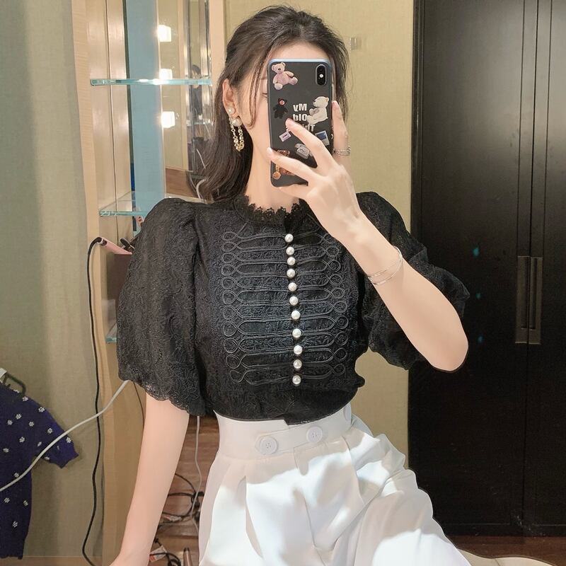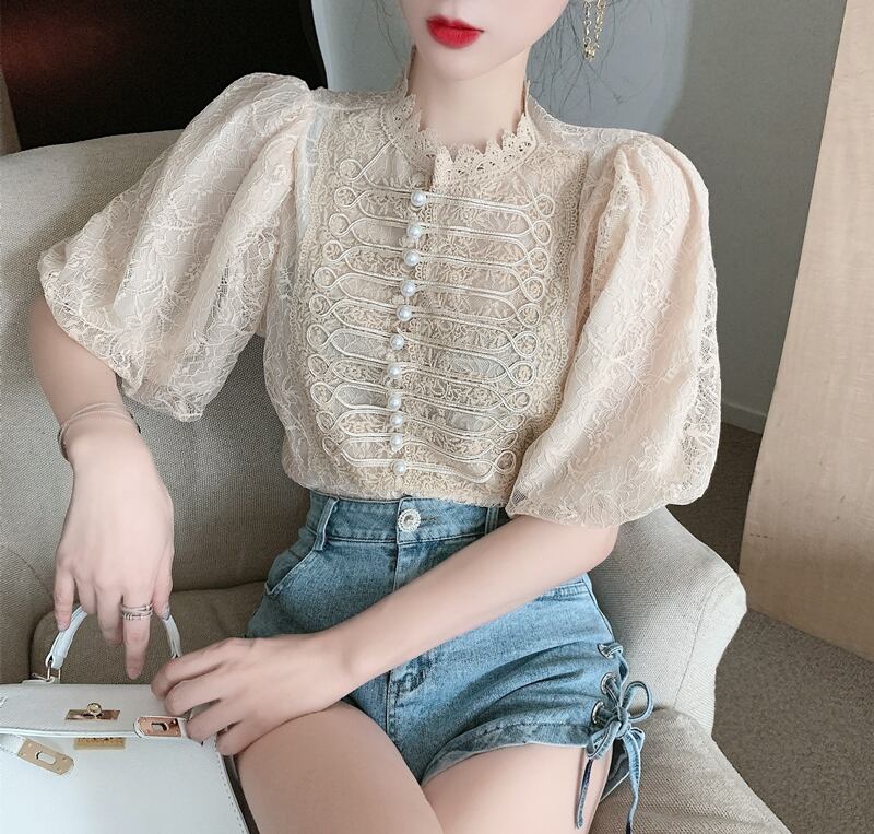 ツーピースセット トップス ボトムス パンツ ブラウス 白トップス デニムパンツ ショートパンツ ショート丈 袖あり 半袖 ボリューム袖 スタンドカラー ストレート レース 透け感 デニム 上下セット 2点セット ツーピース かわいい シンプル おしゃれ お洒落 こなれ感 存在感 無地 春 夏 10代 20代 レディース 女性用 デート お出かけ 女子会 休日 着回し 普段使い モテ 脚長 S M 白 ホワイト 黒 ブラック アプリコット