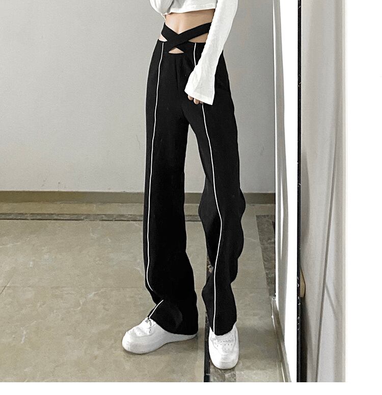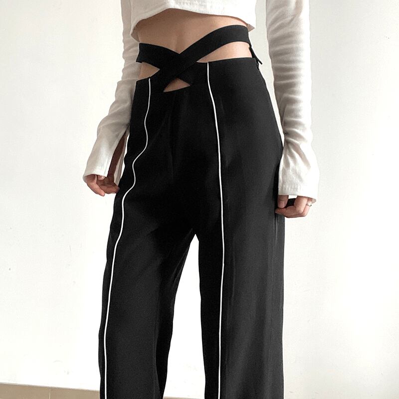 ウエストのクロスデザインが個性的なパンツ。