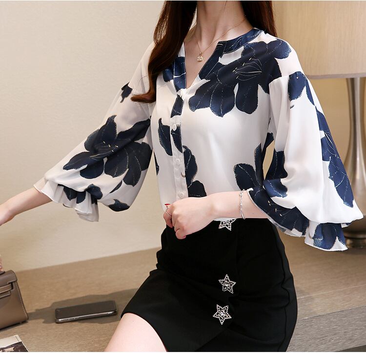 大きな花柄とボリュームのあるフリル袖がエレガントな七分袖ブラウス。