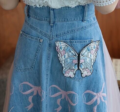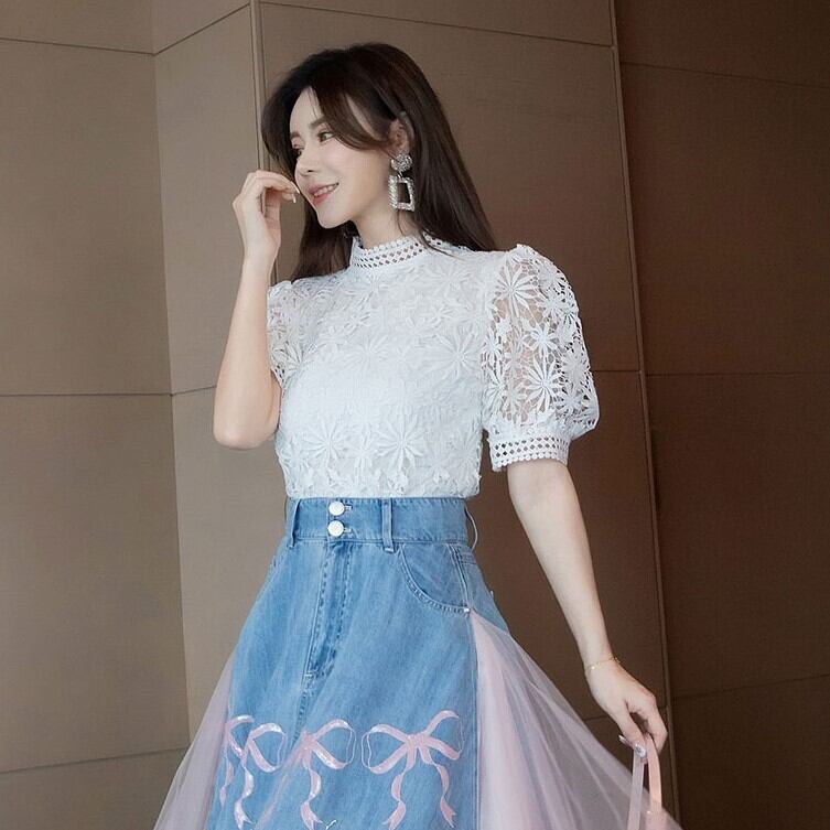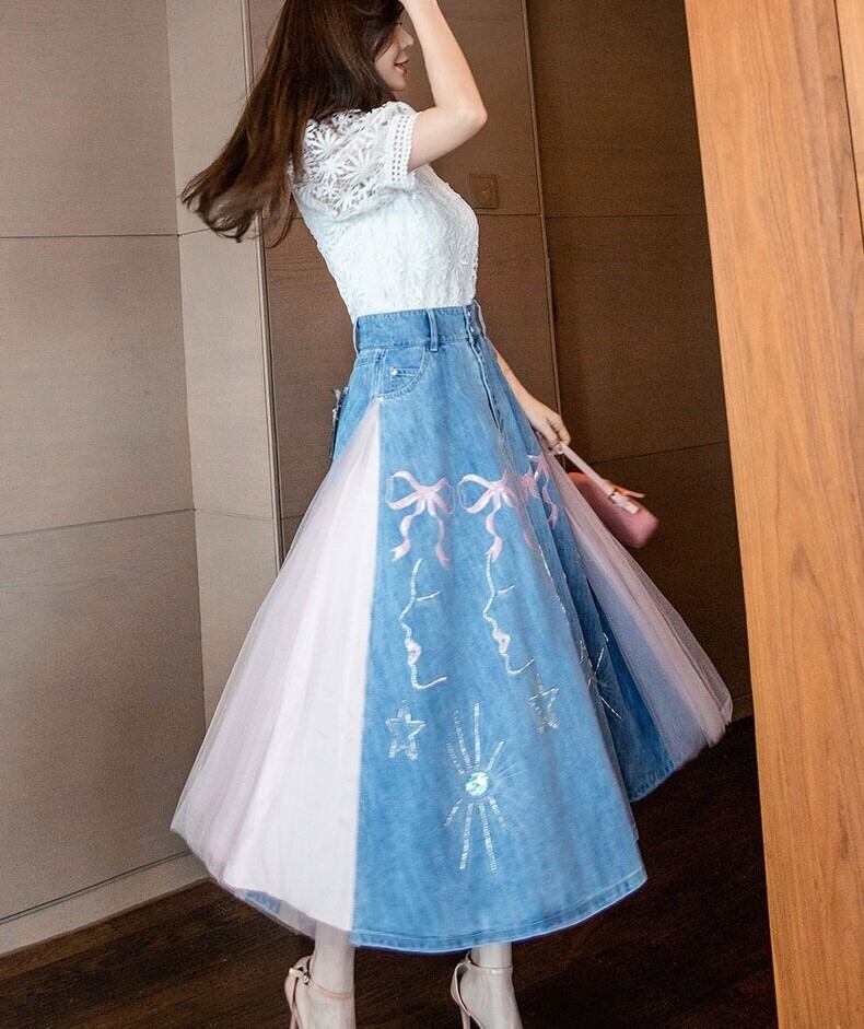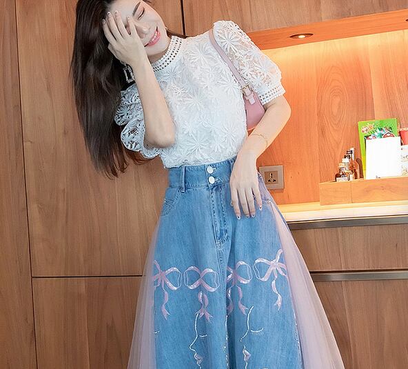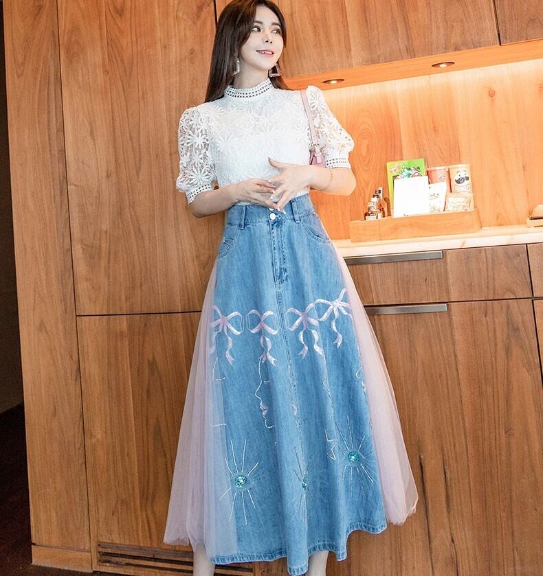 ツーピース トップス スカート ブラウス デニムスカート ミモレ丈 袖あり 半袖 パフスリーブ スタンドカラー Aライン 刺繍 チュール ドッキング ポケット ハイウエスト デニム かわいい きれいめ シンプル カジュアル 上品 おしゃれ 大人女子 ラブリー ガーリー 主役級 柄 パターン柄 春 夏 2022 10代 20代 30代 レディース デート お出かけ 女子会 休日 イベント 旅行 着回し 普段使い 韓国系 ファッション モテ 美脚 新作インスタ映え サイズ S M L XL 2XL