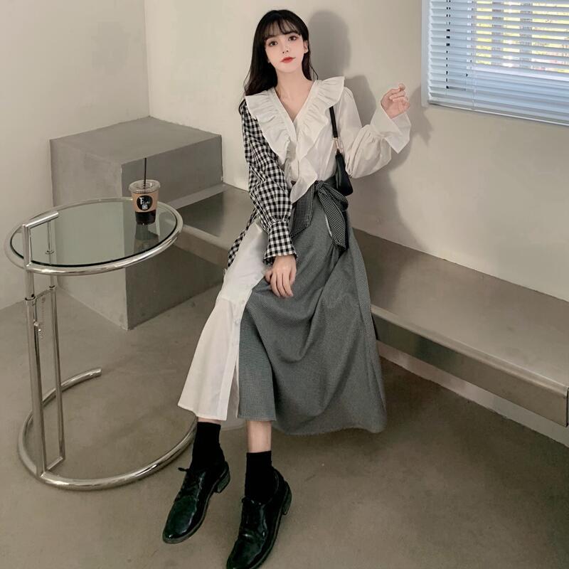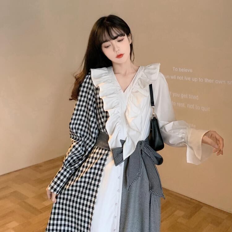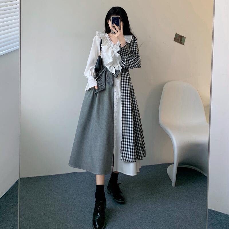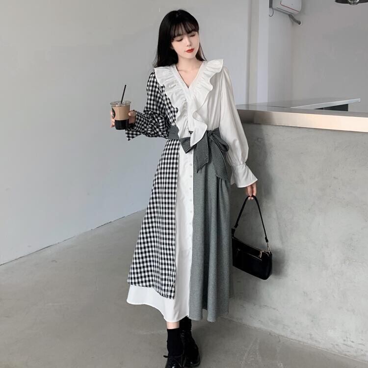 ワンピース シャツワンピース 膝下 袖あり 長袖 Vネック Aライン フリル ウエストリボン 切り替えデザイン ドッキング ハイウエスト 大人可愛い きれいめ 上品 おしゃれ レトロ こなれ感 ラブリー エレガント 主役級 チェック柄 秋 冬 2021 10代 20代 レディース 学生 デート お出かけ 女子会 休日 イベント ホテル レストラン 着回し 普段使い オルチャン ファッション モテ 美脚 新作 トレンド インスタ映え サイズ展開豊富 色展開 ブラック