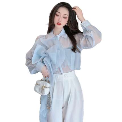 大きなリボンがポイントのシアーシャツとホワイトのパンツのセットアップ。
