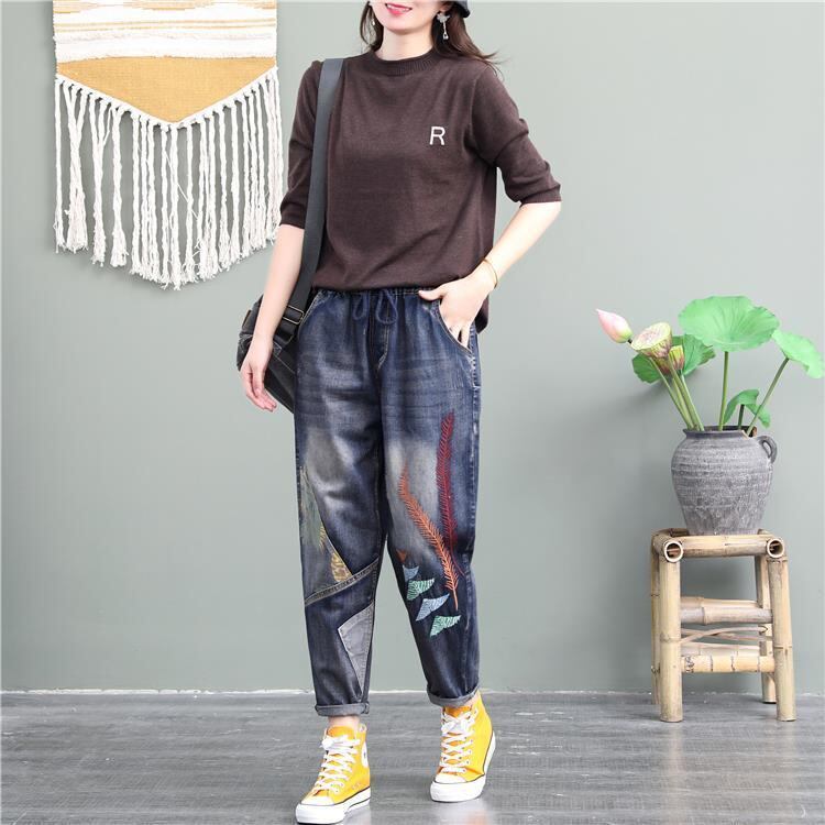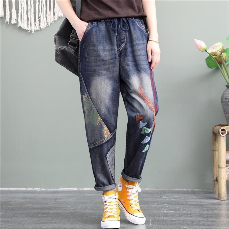 ゆったりとした大きなサイズジーンズ女性ハイウエストエスニックスタイル刺繍ハレンパンツパッチワーク パンツ Gパン デニムパンツ 9分丈 アンクル丈 ストレート ハイウエスト ウエストゴム デニム 大人可愛い きれいめ カジュアル おしゃれ かっこいい レトロ アジアン エスニック こなれ感 ラフ 柄 花柄 春 夏 秋 10代 20代 30代 レディース 女性用 OL 通勤 学生 通学 お出かけ 公園デビュー 休日 着回し 普段使い 重ね着 楽ちん S M L XL 2XL 3XL 大きいサイズ グレー