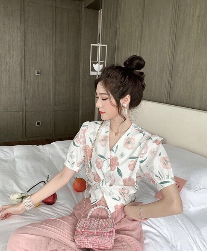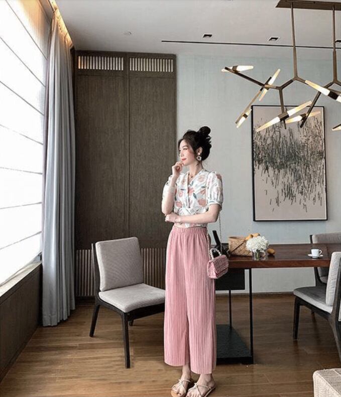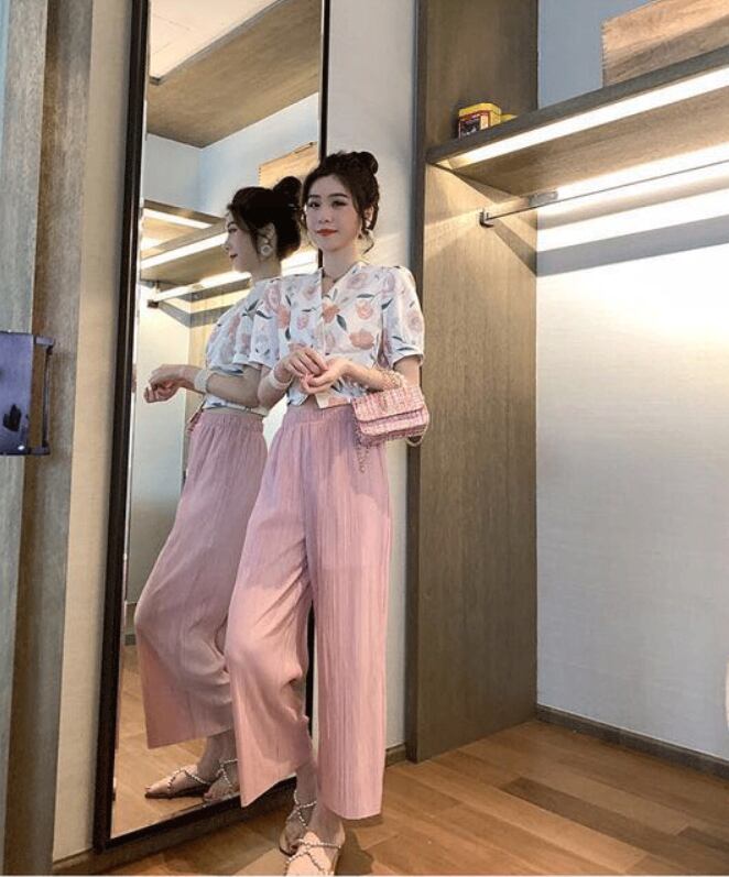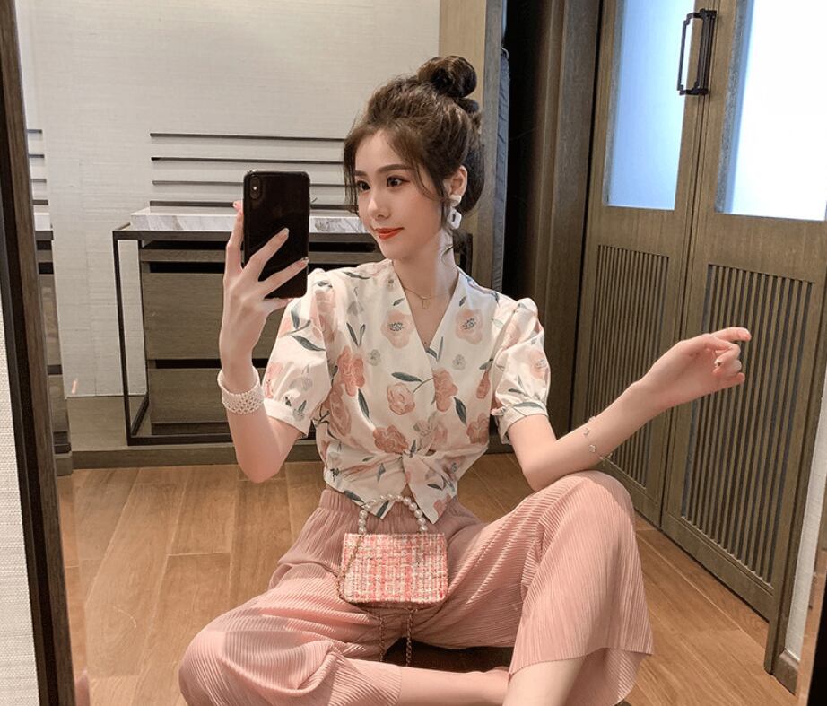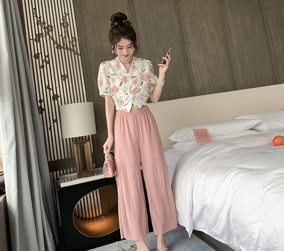 花柄の半袖ブラウスとワイドパンツのツーピースセット。