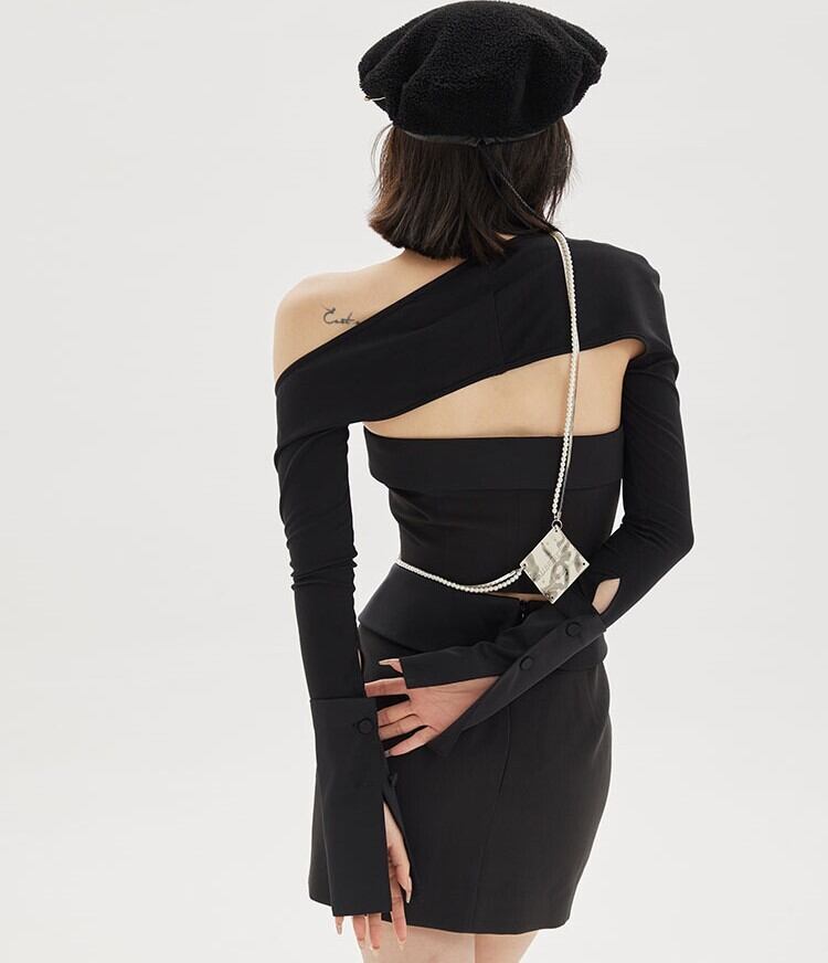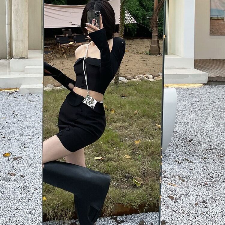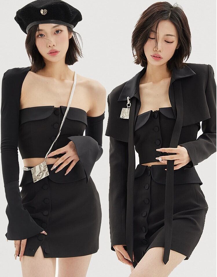スリーピース トップス スカート チューブトップ ショート丈 袖あり 長袖 スリム ストレート ハイウエスト 大人可愛い カジュアル おしゃれ かっこいい 大人女子 クール モード系 セクシー 存在感 無地 春 秋 2021 10代 20代 レディース デート お出かけ 休日 パーティー イベント 着回し 普段使い オルチャン コーデ モテ 美脚 脚長 新作 トレンド インスタ映え サイズ XS S M L 色展開 ブラック