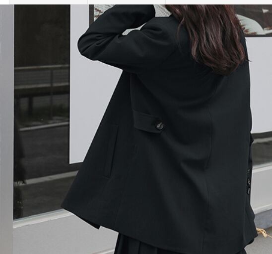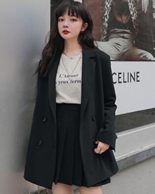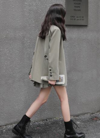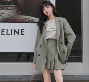ロング丈ジャケットとプリーツミニ丈スカートのセットアップです。