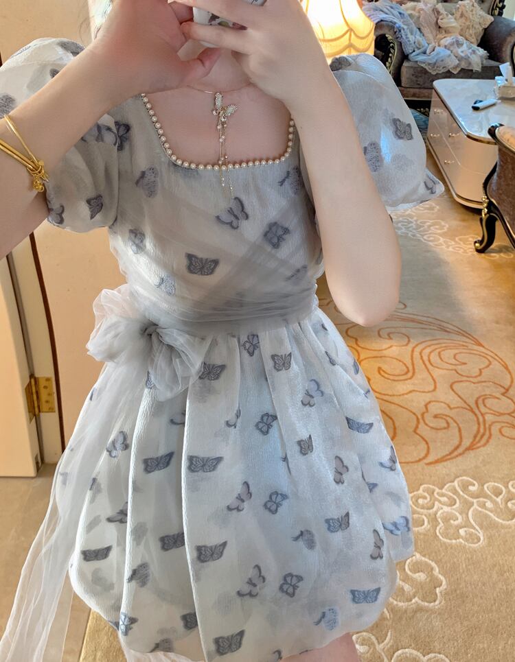 蝶々柄ワンピース ワンピース フレアワンピース ワンピドレス ミニ ミニ丈 袖あり 半袖 パフスリーブ スクエアネック フレア レース チュール ウエストマーク ウエストリボン ハイウエスト かわいい 大人可愛い きれいめ シンプル カジュアル 大人 上品 おしゃれ お洒落 大人可愛い 大人女子 こなれ感 ラフ ラブリー キュート ガーリー 個性的 モダン 主役級 存在感 柄 春 夏 10代 20代 30代 レディース 学生 通学 デート お出かけ 女子会 休日 着回し 普段使い 重ね着