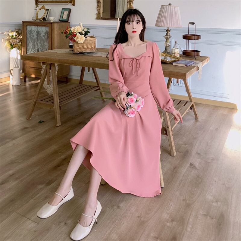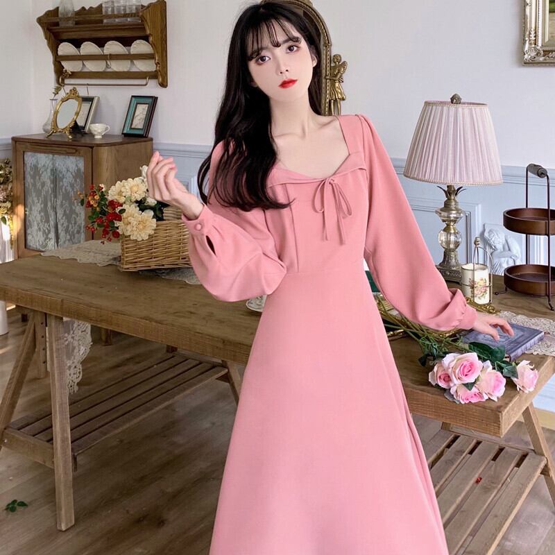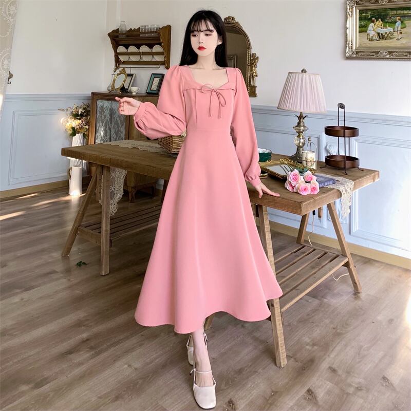 ワンピース ワンピドレス ミモレ丈 袖あり ボリューム袖 スクエアネック スリム Aライン リボン ハイウエスト かわいい 大人可愛い きれいめ 上品 おしゃれ 大人女子 ラブリー キュート エレガント 存在感 とろみ感 無地 春 秋 謝恩会 二次会 2022 10代 20代 レディース デート お出かけ 女子会 休日 パーティー イベント ホテル レストラン 着回し 普段使い モテ 美脚 新作 トレンド インスタ映え フレンチスタイル サイズ展開豊富 色展開 ピンク