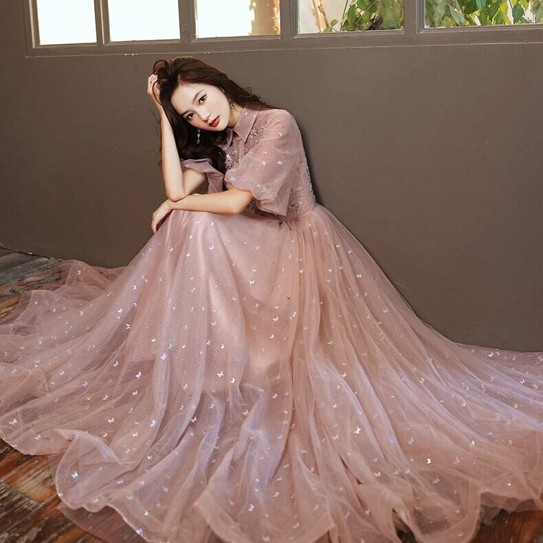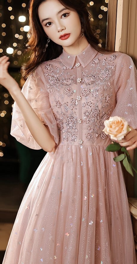 プリンセス ドレス 膝丈 ロング丈 5分袖 パフスリーブ 襟付き POLO襟 Aライン 切り替えデザイン 刺繍 ファスナー ハイウエスト 透け感 かわいい 大人可愛い きれいめ 上品 おしゃれ レトロ 大人女子 ラブリー キュート 個性的 セクシー エレガント 主役級 フラワー 蝶 春 夏 秋 二次会 披露宴 2021 10代 20代 30代 レディース パーティー イベント ホテル レストラン モテ 新作 インスタ映え サイズ XS S M L XL 2XL 色展開 ダスティピンク