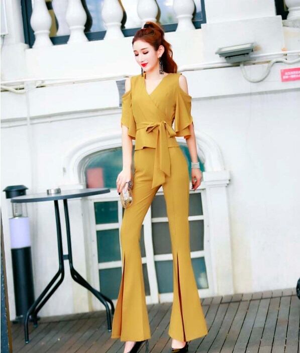 夏服Vネック女性スキニーホーンパンツ セットアップ Tシャツ ズボン スキニーパンツ ロング丈 半袖 Vネック スリム ウエストリボン スリット 切り替えデザイン 2点セット 大人可愛い カジュアル 大人 おしゃれ かっこいい レトロ 大人女子 こなれ感 ラフ 個性的 クール モード系 セクシー 存在感 無地 春 夏 秋 10代 20代 OL 通勤 学生 通学 デート お出かけ 女子会 お泊まり リゾート 旅行 コーデ S M L XL ブラック ブルー イエロー ピンク