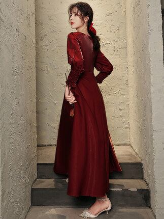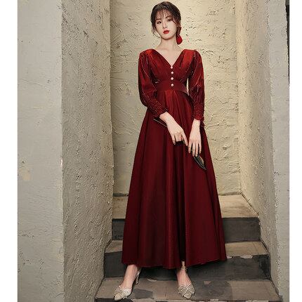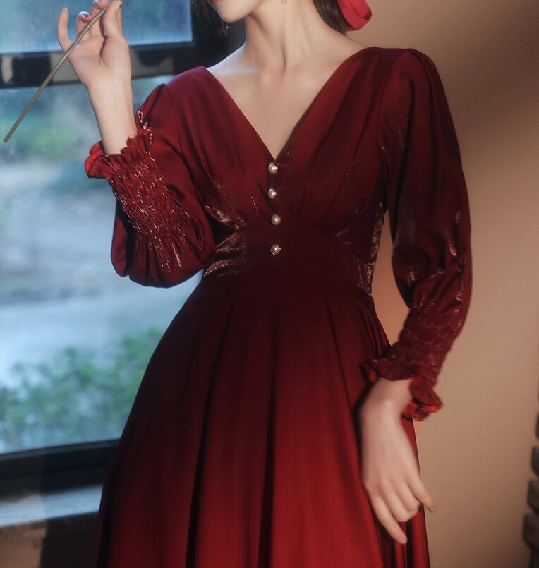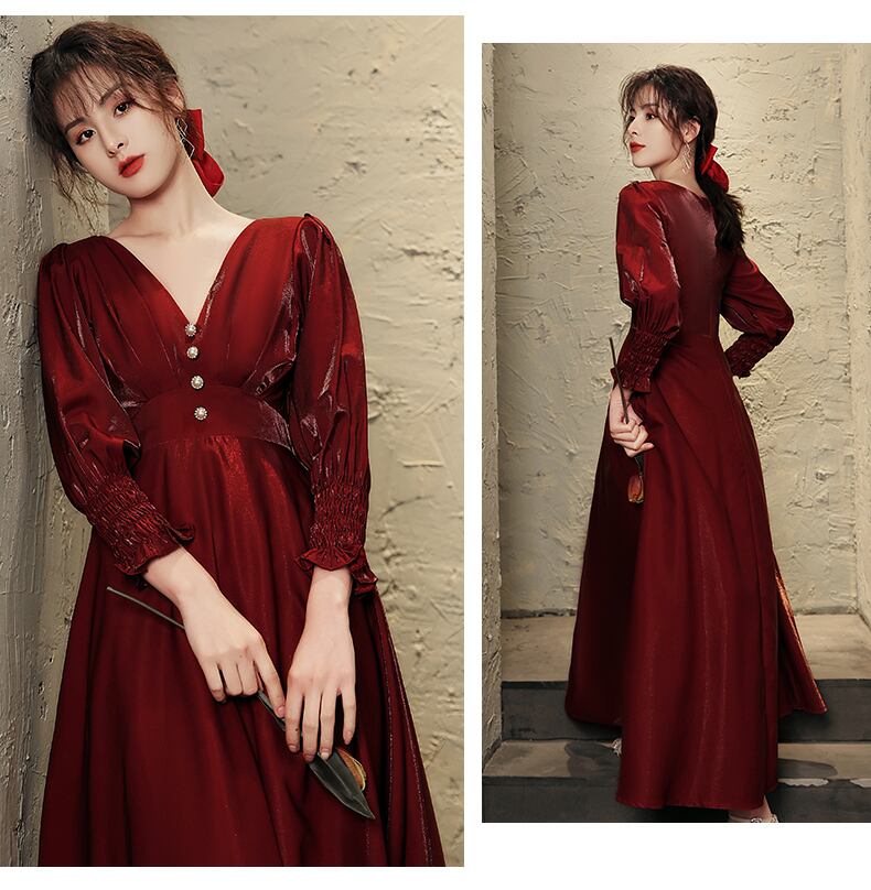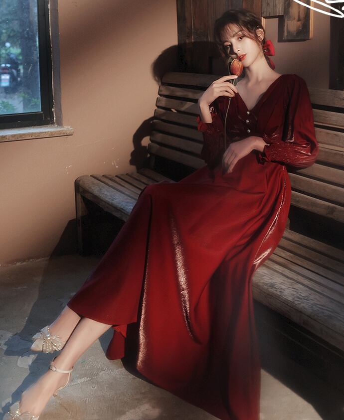 Vネックのワインレッドロングワンピース。