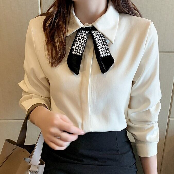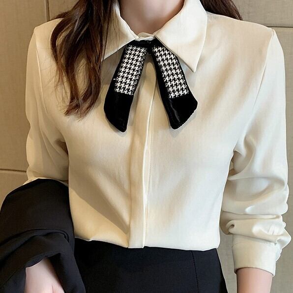 トップス シャツ ミディアム丈 袖あり 長袖 襟付き ポロカラー ストレート リボン かわいい 大人可愛い きれいめ 上品 おしゃれ レトロ 大人女子 こなれ感 エレガント 主役級 フォーマル 千鳥格子 春 秋 2022 20代 30代 40代 レディース 通勤 デート お出かけ 女子会 休日 ホテル レストラン 着回し 普段使い 重ね着 韓国系 ファッション モテ 新作 トレンド サイズ S M L XL 2XL 色展開 ブラウン アプリコット