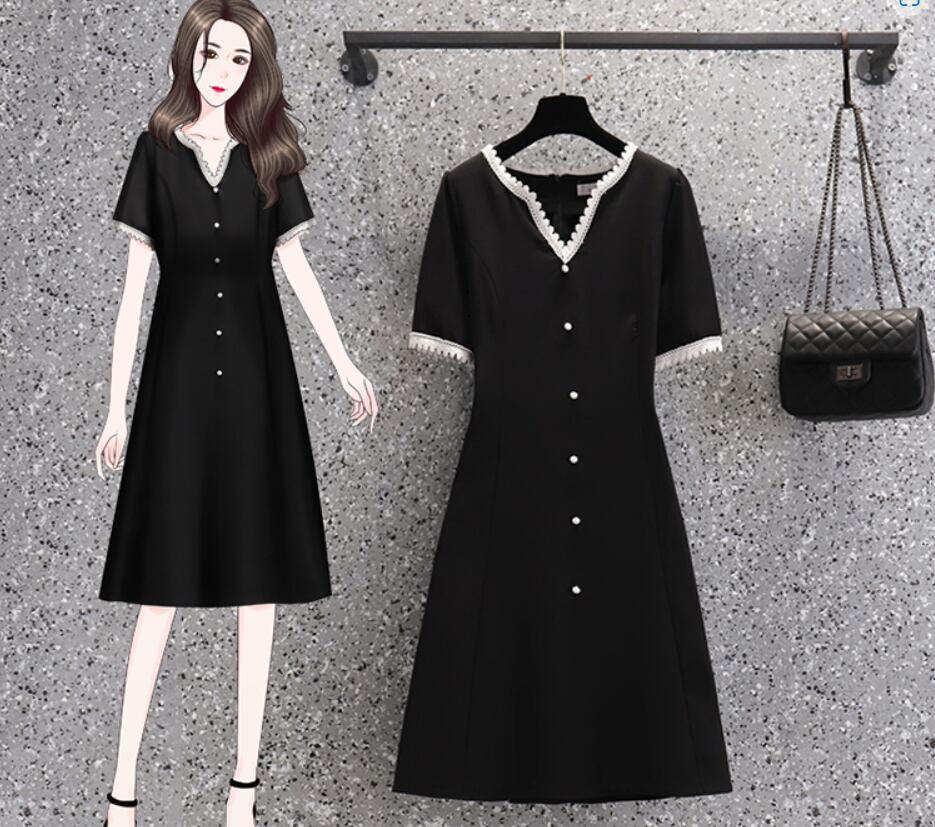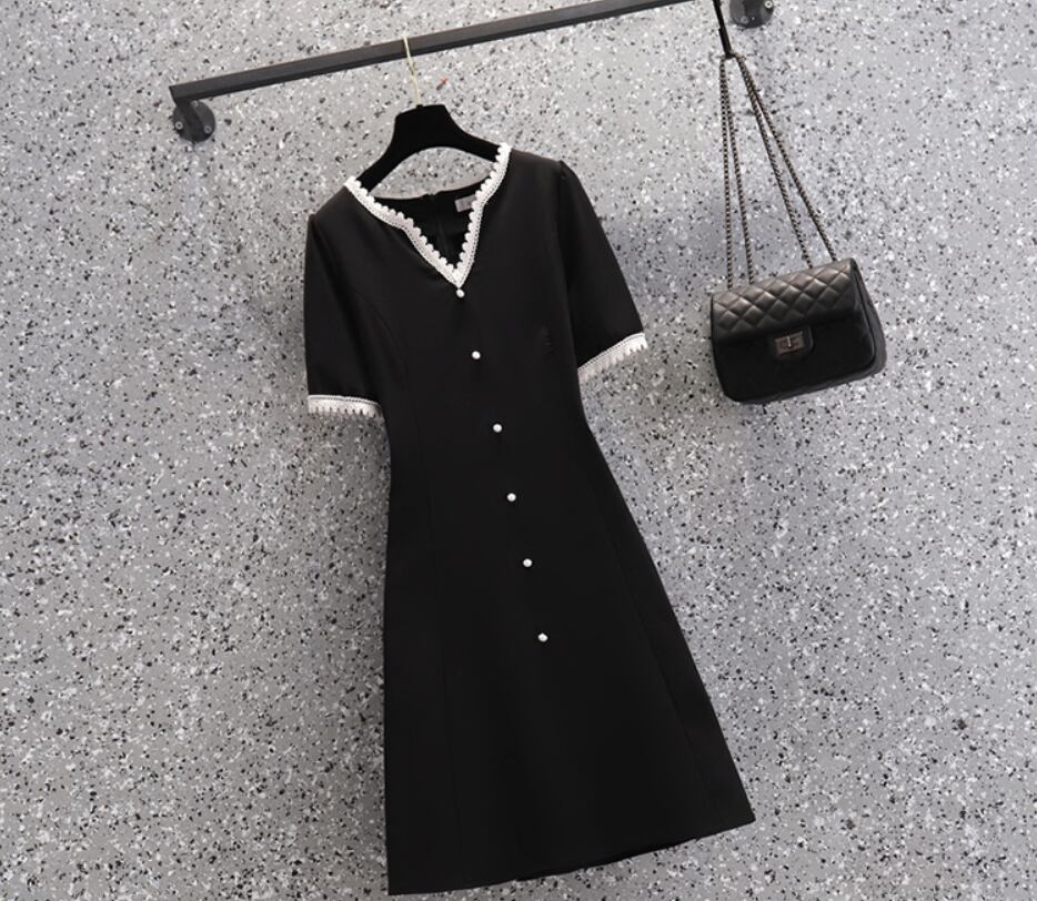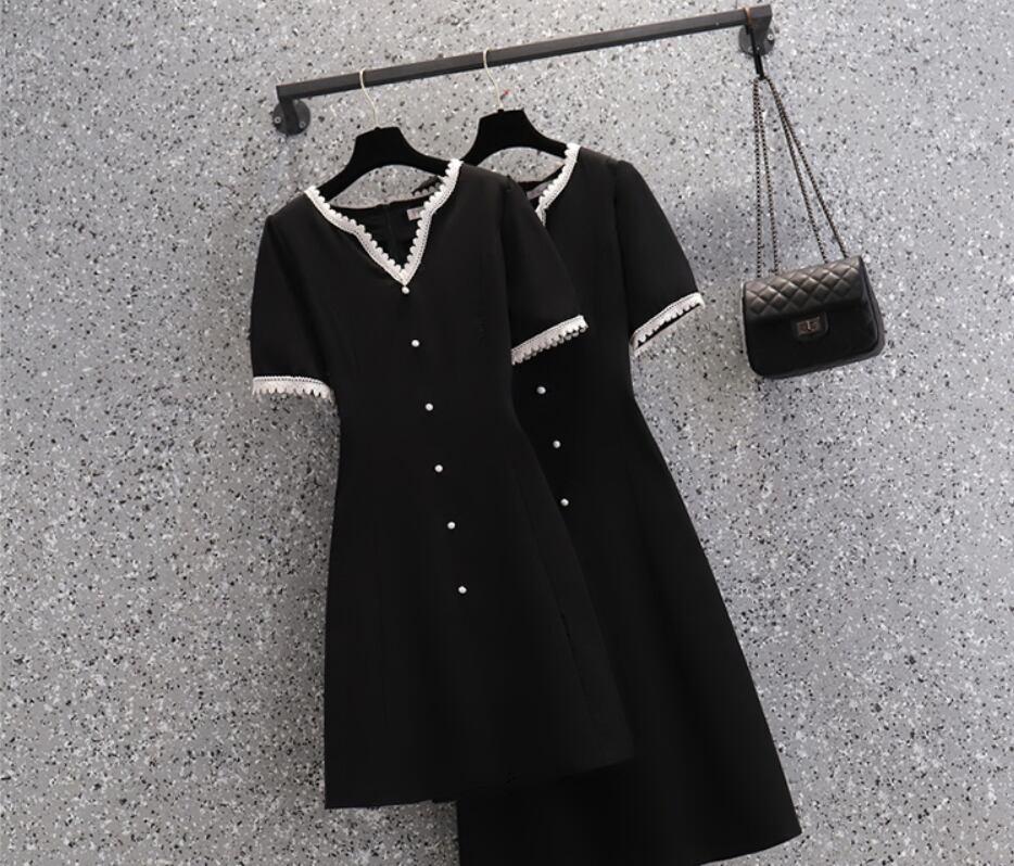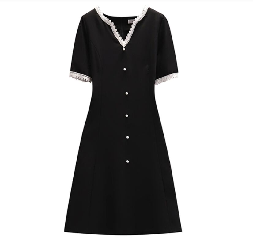 ワンピース 膝丈 ミディアム丈 袖あり 半袖 袖コンシャス Vネック Aライン レース リボン シンプル 上品 レトロ 無地 夏 入学式 入園式 卒業式 卒園式 謝恩会 10代 20代 30代 40代 レディース 女性用 ママ デート お出かけ 女子会 休日 普段使い 楽ちん 体型カバー L XL 2XL 黒 ブラック
