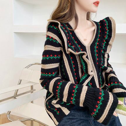 大きなフロントフリルとVネックで小顔効果も期待できる花柄ニット。