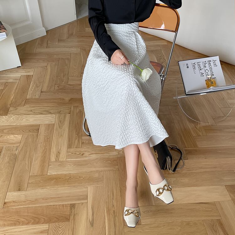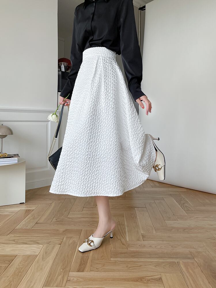 動きに合わせてふんわりと広がり、どの角度からもきれいなシルエットを演出してくれる1枚。
