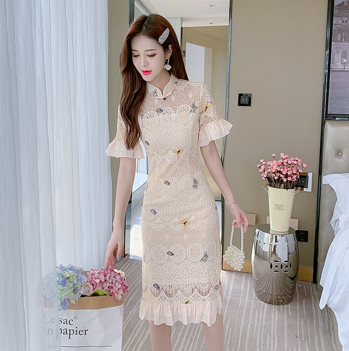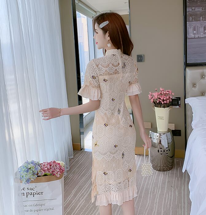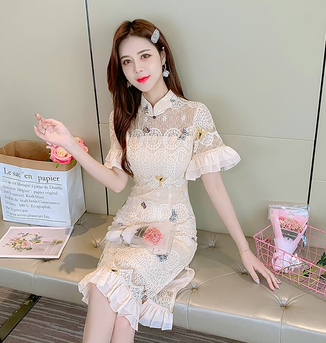 華やかな透かし彫りレースのミニ丈ワンピース。